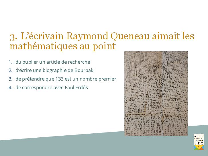du publier un article de recherche 2. d’écrire une biographie de Bourbaki 3. de prétendre que 133 est un nombre premier 4. de correspondre avec Paul Erdős