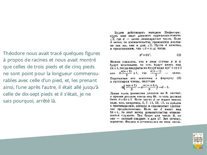 et nous avait montré que celles de trois pieds et de cinq pieds ne sont point pour la longueur commensu- rables avec celle d’un pied, et, les prenant ainsi, l’une après l’autre, il était allé jusqu’à celle de dix-sept pieds et il s’était, je ne sais pourquoi, arrêté là.