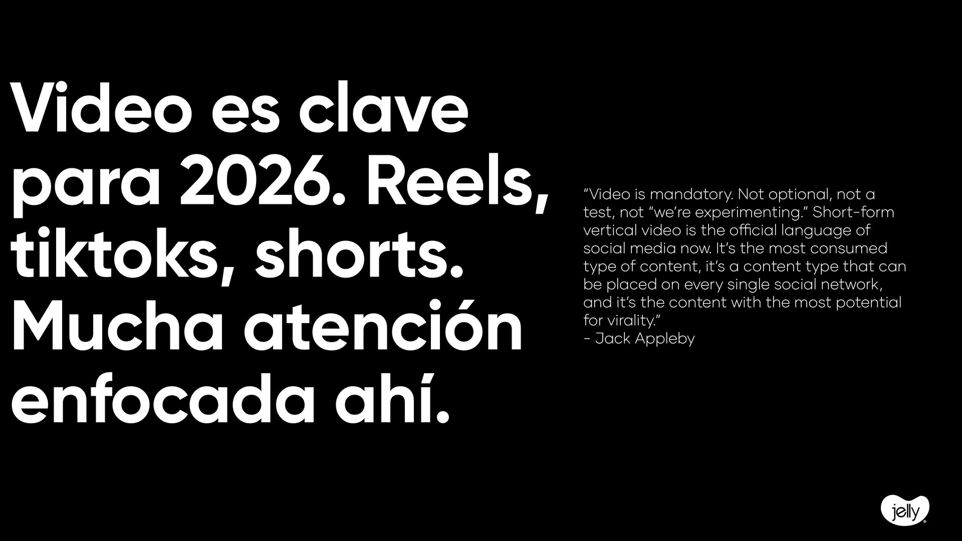 experimenting.” Short-form vertical video is the o ff i cial language of social media now. It’s the most consumed type of content, it’s a content type that can be placed on every single social network, and it’s the content with the most potential for virality.” - Jack Appleby Video es clave para 2026. Reels, tiktoks, shorts. Mucha atención enfocada ahí.