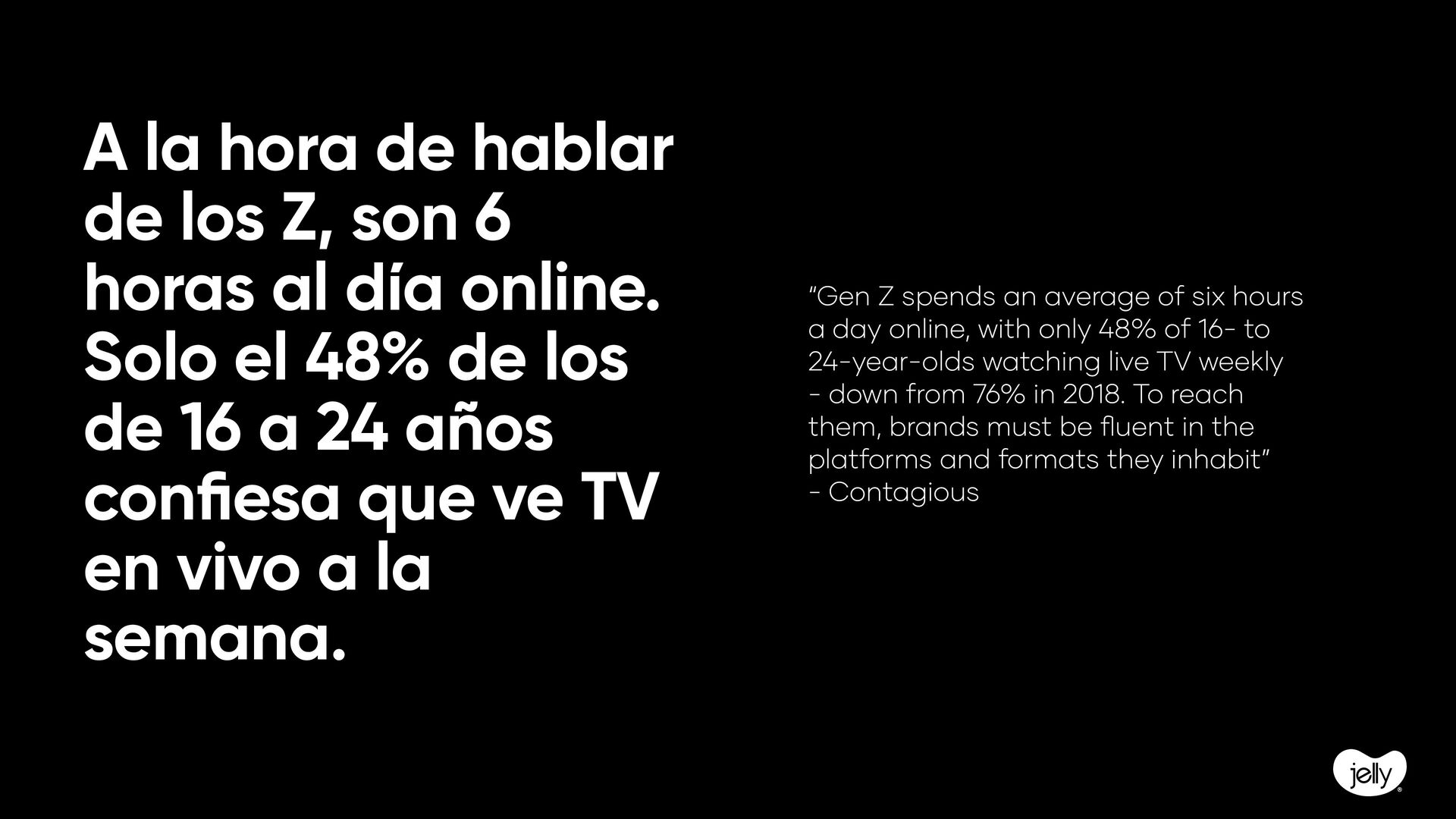 online, with only 48% of 16- to 24-year-olds watching live TV weekly - down from 76% in 2018. To reach them, brands must be fl uent in the platforms and formats they inhabit” - Contagious A la hora de hablar de los Z, son 6 horas al día online. Solo el 48% de los de 16 a 24 años con fi esa que ve TV en vivo a la semana.
