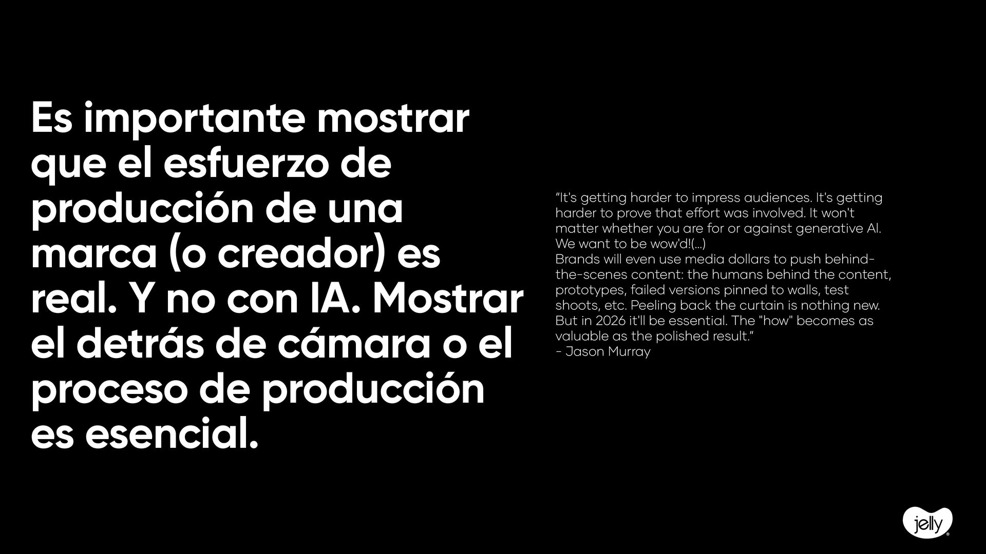 prove that e ff ort was involved. It won't matter whether you are for or against generative Al. We want to be wow'd!(…) Brands will even use media dollars to push behind- the-scenes content: the humans behind the content, prototypes, failed versions pinned to walls, test shoots, etc. Peeling back the curtain is nothing new. But in 2026 it'll be essential. The "how" becomes as valuable as the polished result.” - Jason Murray Es importante mostrar que el esfuerzo de producción de una marca (o creador) es real. Y no con IA. Mostrar el detrás de cámara o el proceso de producción es esencial.