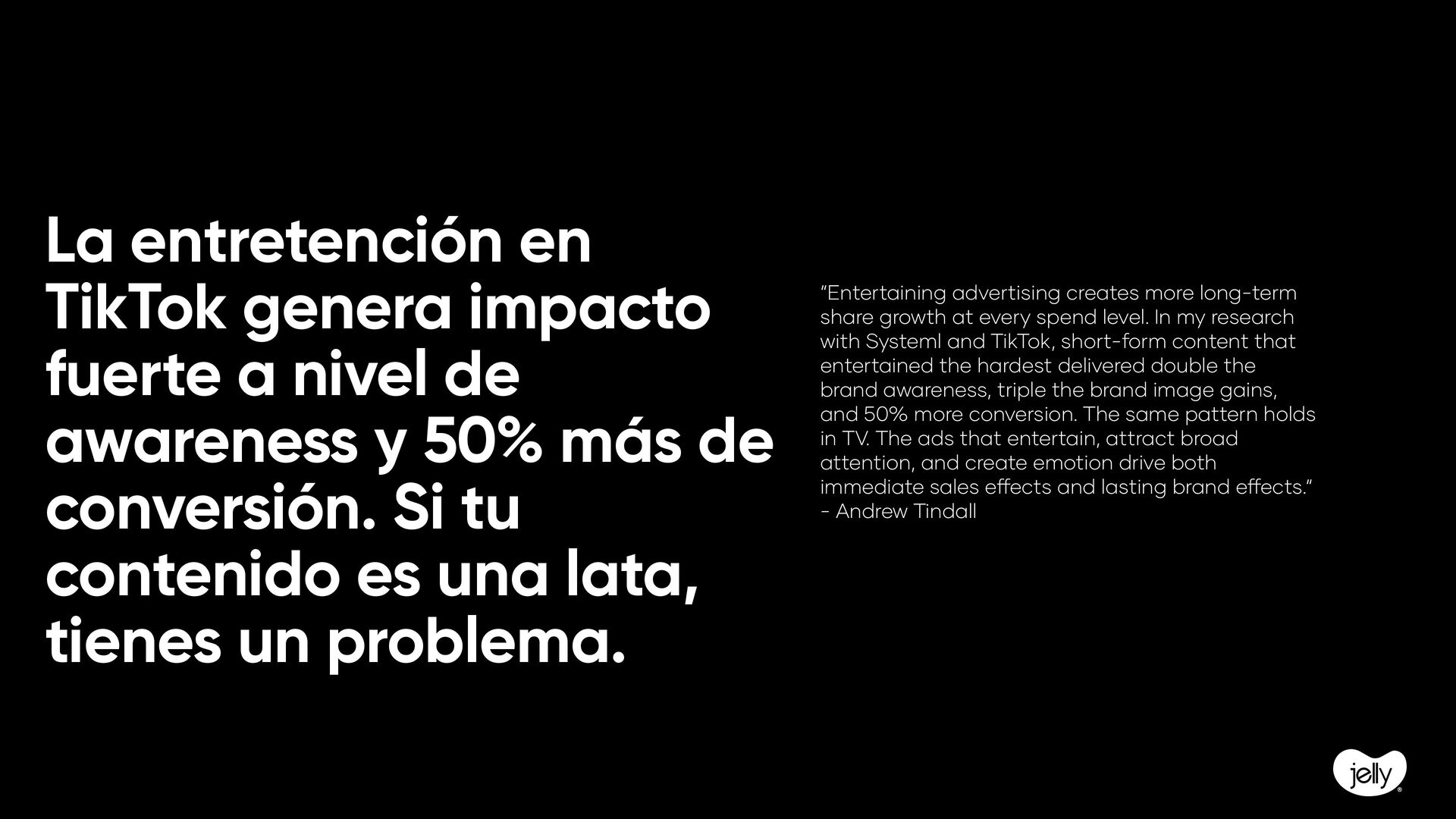 level. In my research with Systeml and TikTok, short-form content that entertained the hardest delivered double the brand awareness, triple the brand image gains, and 50% more conversion. The same pattern holds in TV. The ads that entertain, attract broad attention, and create emotion drive both immediate sales e ff ects and lasting brand e ff ects.“ - Andrew Tindall La entretención en TikTok genera impacto fuerte a nivel de awareness y 50% más de conversión. Si tu contenido es una lata, tienes un problema.