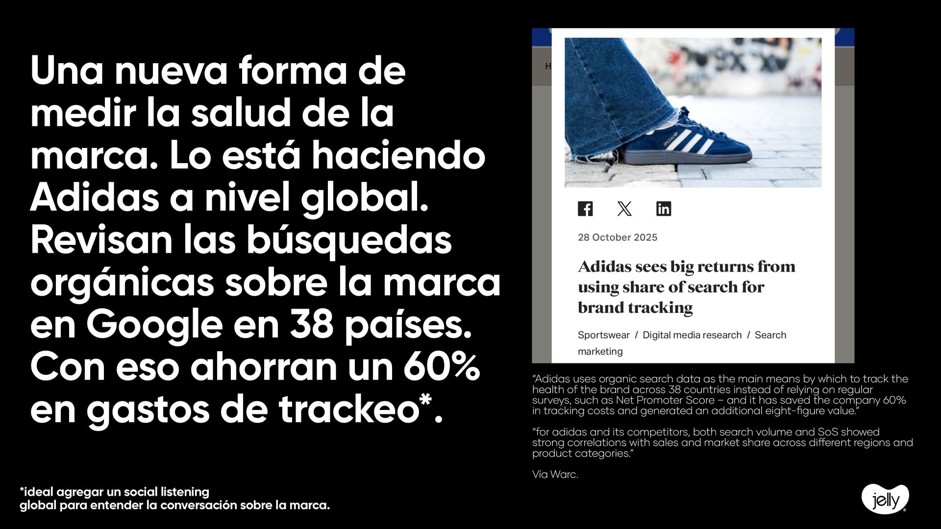 Lo está haciendo Adidas a nivel global. Revisan las búsquedas orgánicas sobre la marca en Google en 38 países. Con eso ahorran un 60% en gastos de trackeo*. *ideal agregar un social listening global para entender la conversación sobre la marca. “Adidas uses organic search data as the main means by which to track the health of the brand across 38 countries instead of relying on regular surveys, such as Net Promoter Score – and it has saved the company 60% in tracking costs and generated an additional eight- fi gure value.” “for adidas and its competitors, both search volume and SoS showed strong correlations with sales and market share across di ff erent regions and product categories.” Vía Warc.