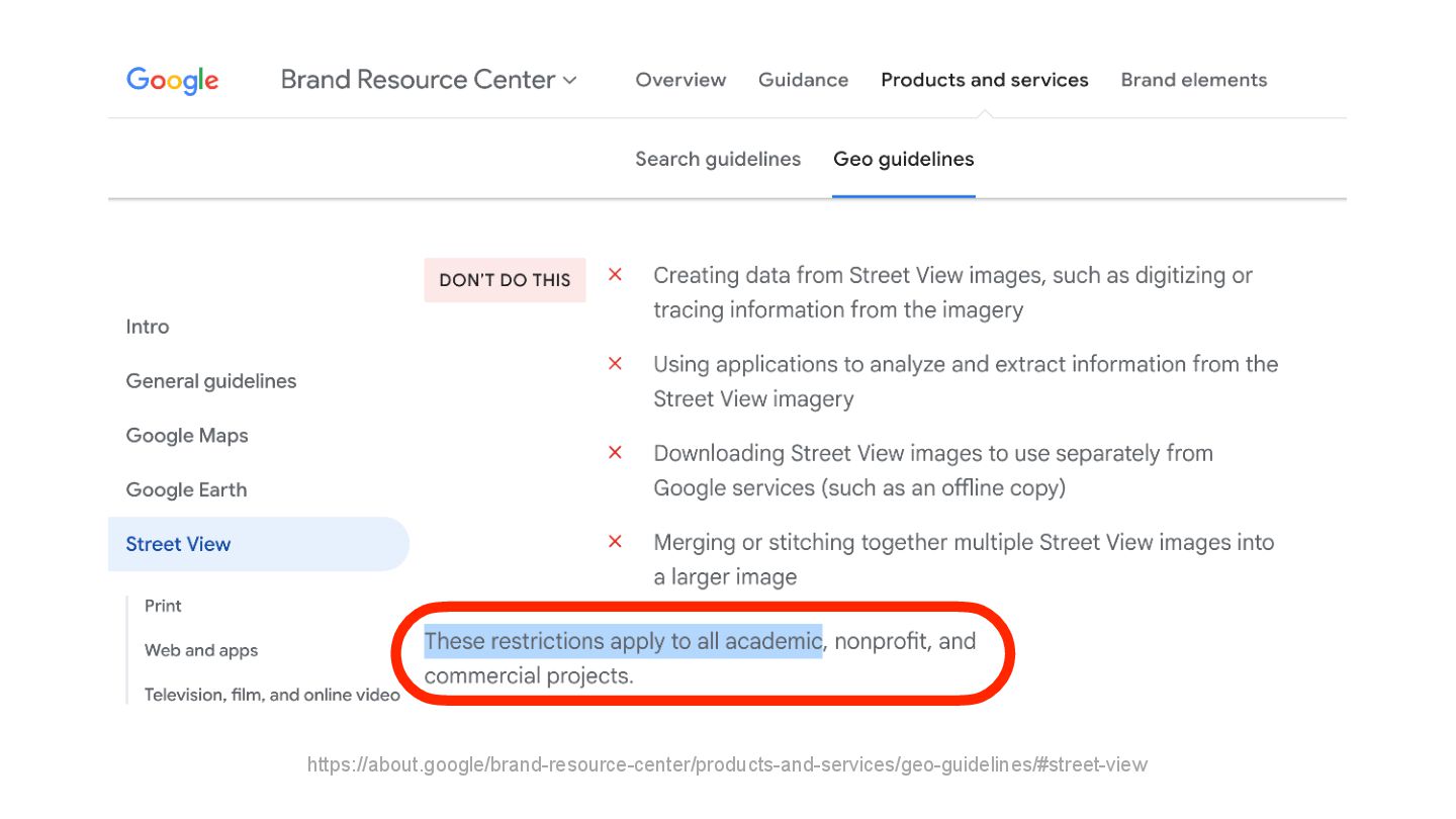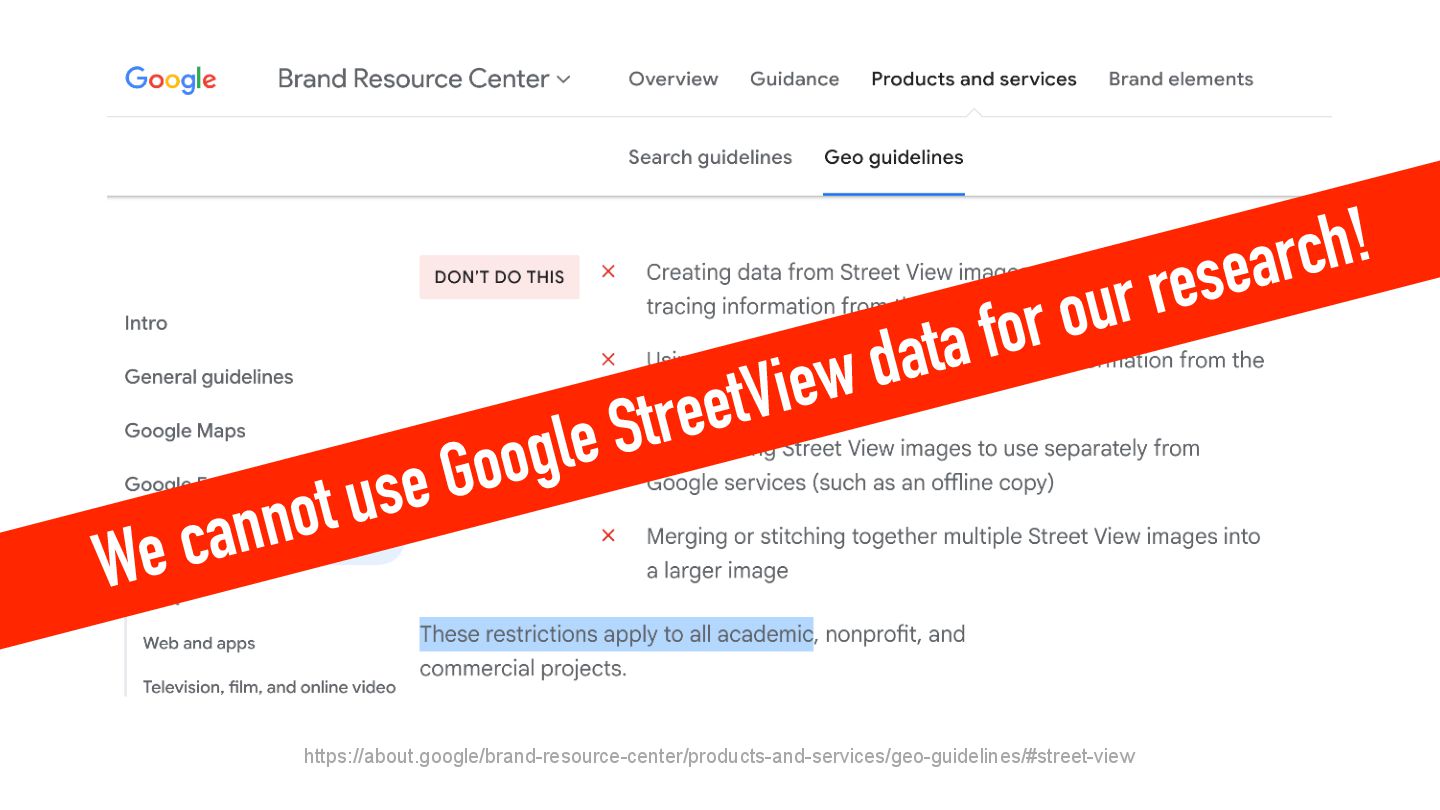 https://about.google/brand-resource-center/products-and-services/geo-guidelines/#street-view We cannot use Google StreetView data for our research!