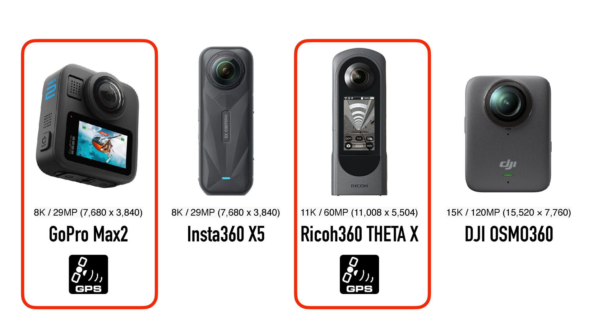 x 5,504) 15K / 120MP (15,520 × 7,760) 8K / 29MP (7,680 x 3,840) GoPro Max2 Insta360 X5 DJI OSMO360 Ricoh360 THETA X