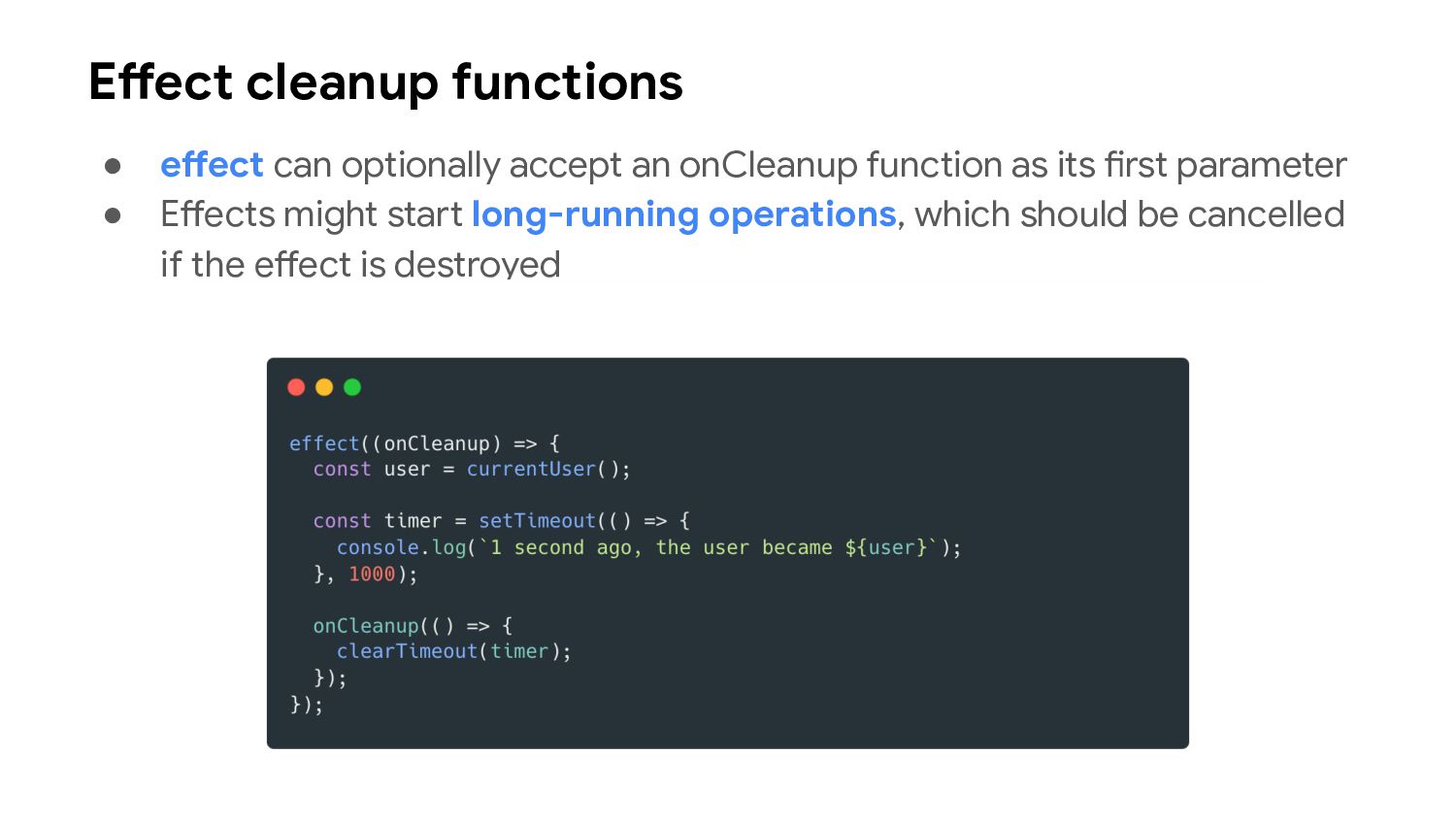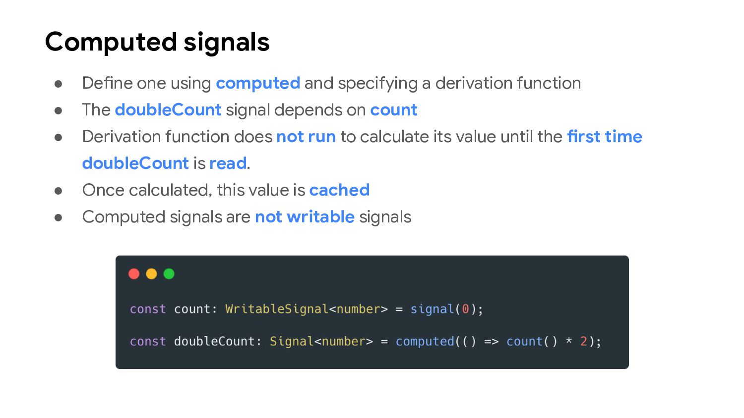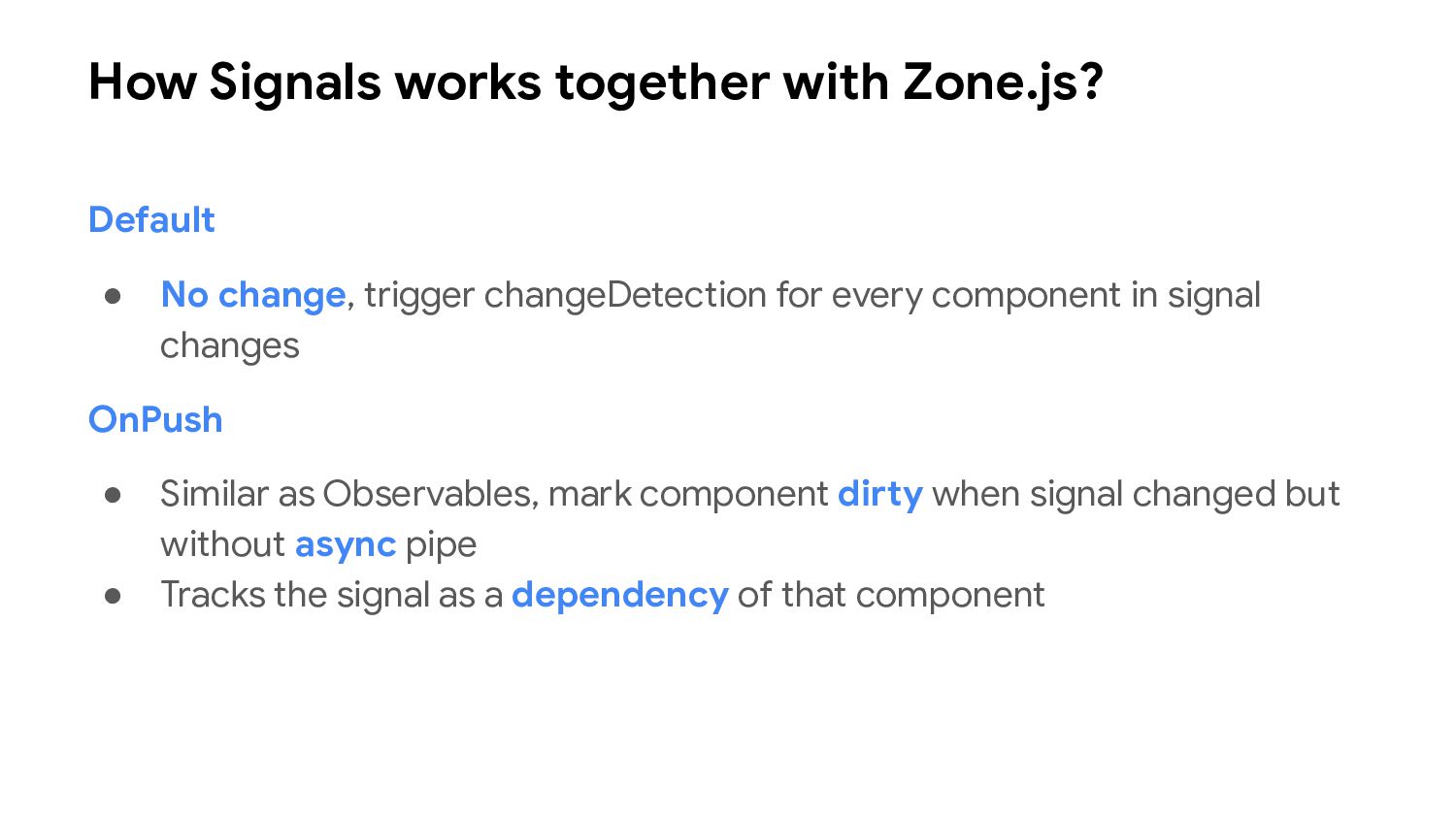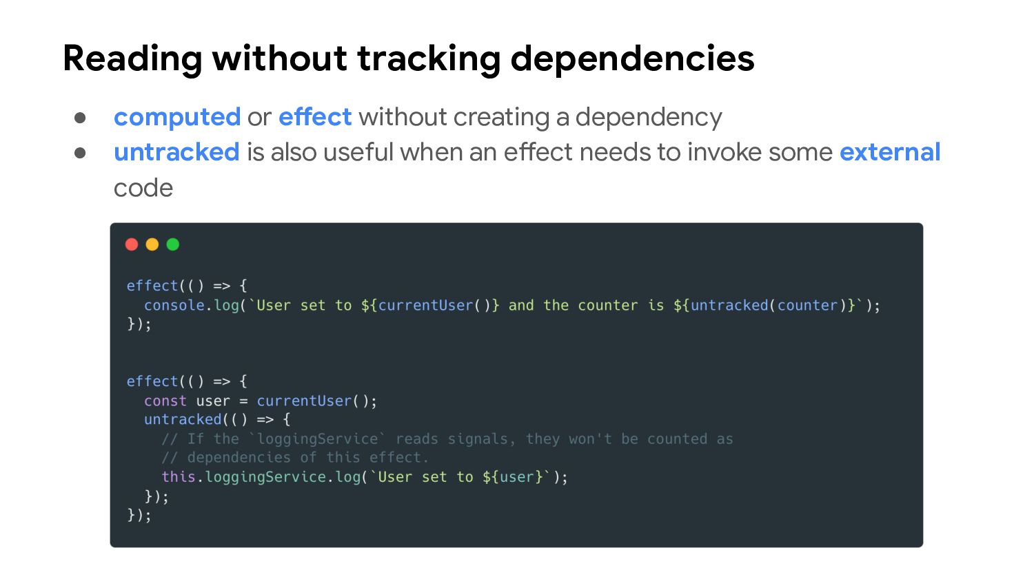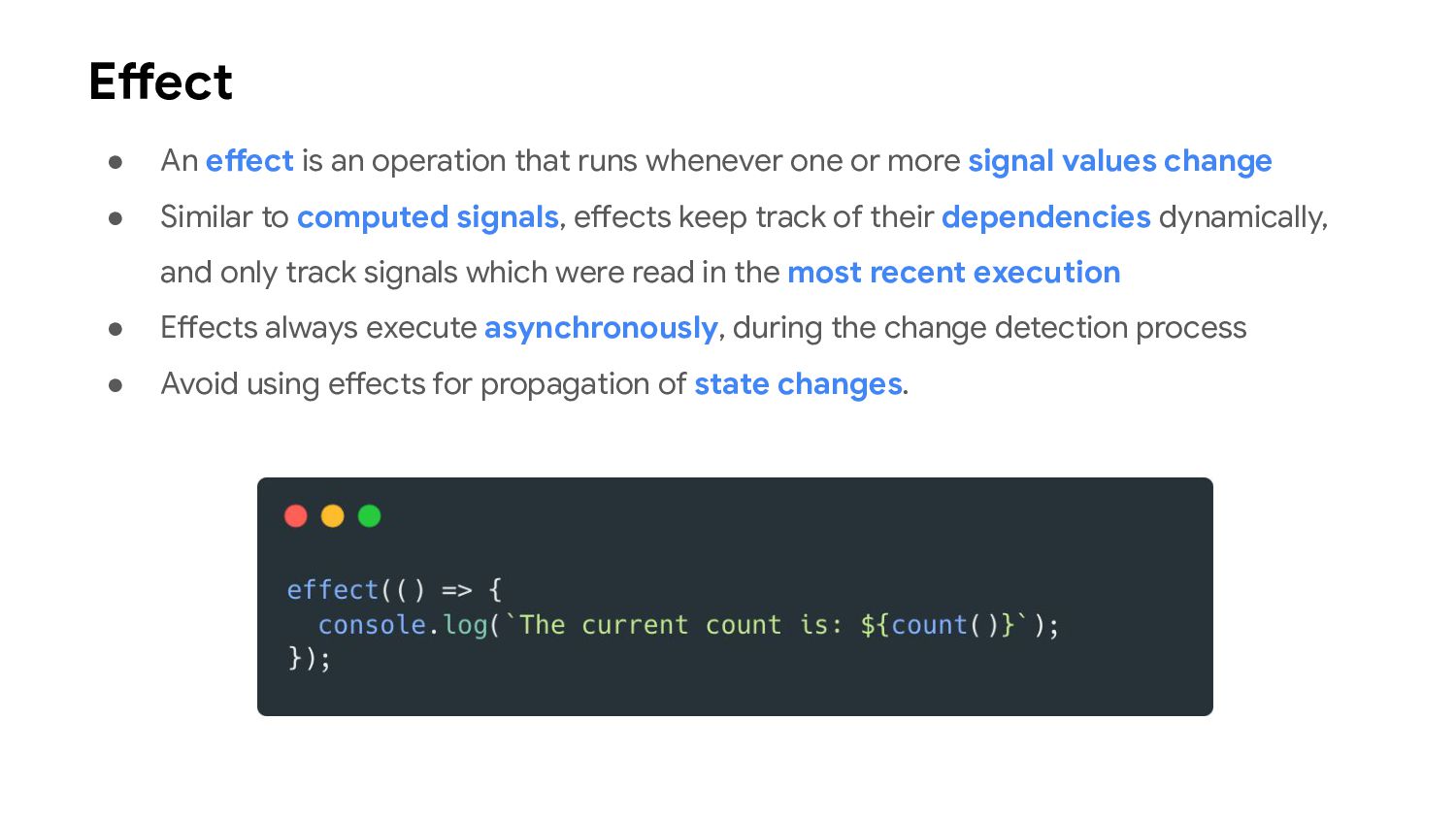 one or more signal values change • Similar to computed signals, effects keep track of their dependencies dynamically, and only track signals which were read in the most recent execution • Effects always execute asynchronously, during the change detection process • Avoid using effects for propagation of state changes.