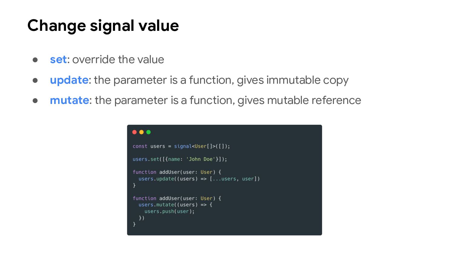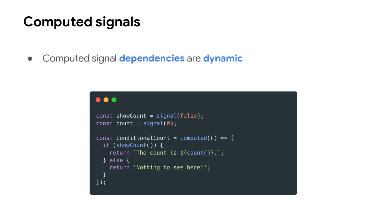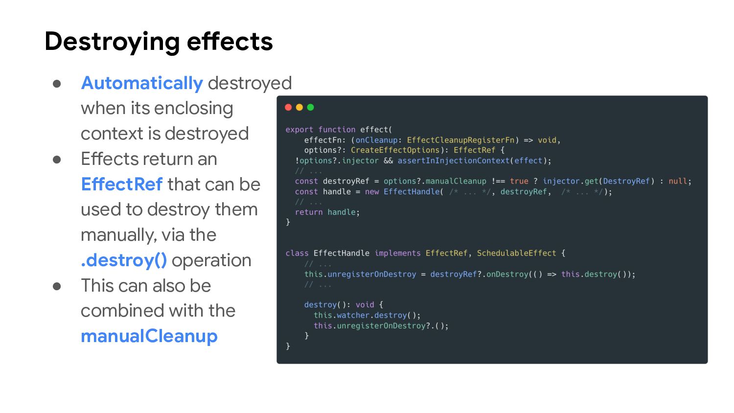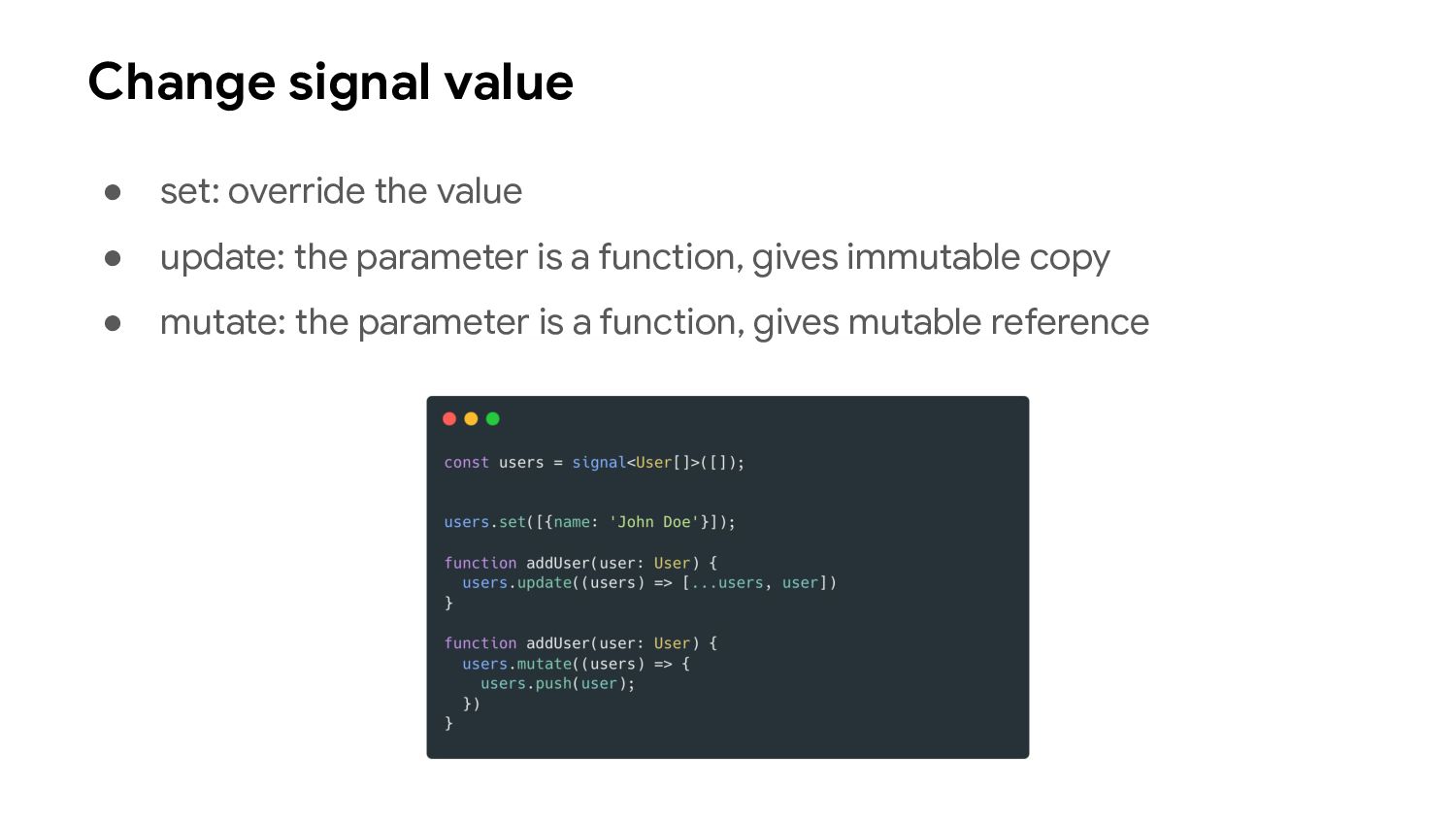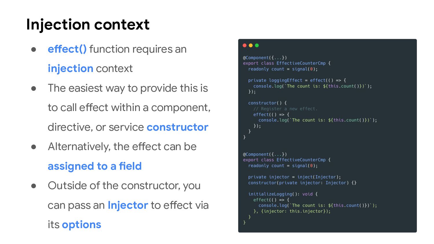 one or more signal values change • Similar to computed signals, effects keep track of their dependencies dynamically, and only track signals which were read in the most recent execution • Effects always execute asynchronously, during the change detection process • Avoid using effects for propagation of state changes.