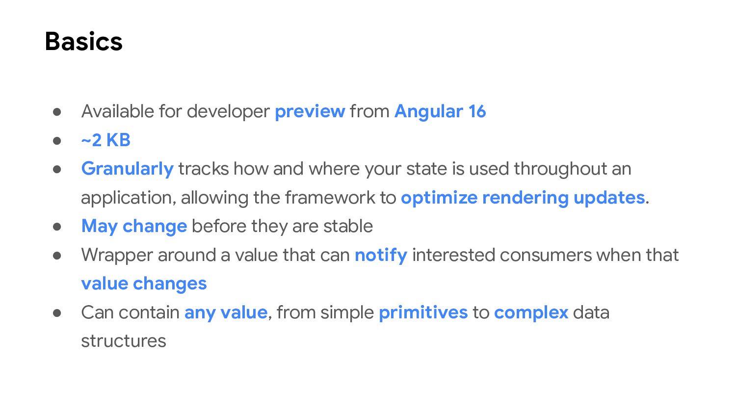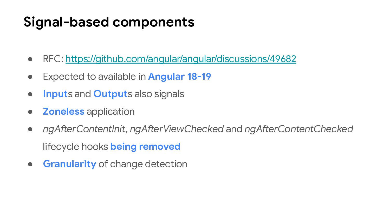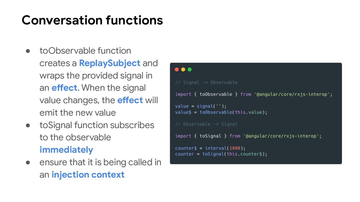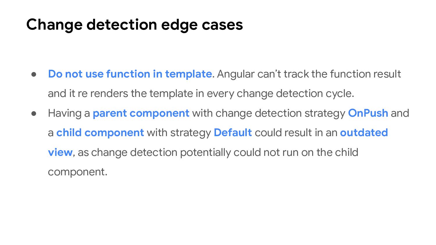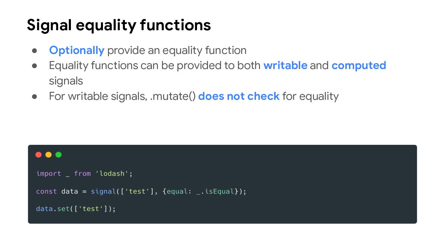 one or more signal values change • Similar to computed signals, effects keep track of their dependencies dynamically, and only track signals which were read in the most recent execution • Effects always execute asynchronously, during the change detection process • Avoid using effects for propagation of state changes.