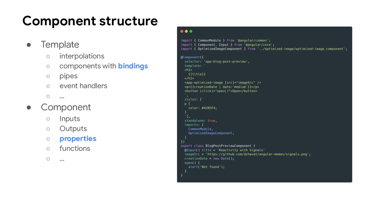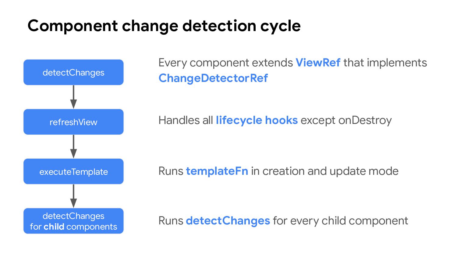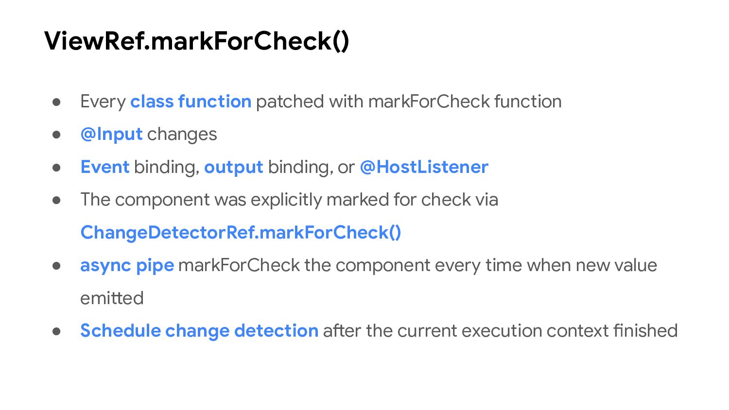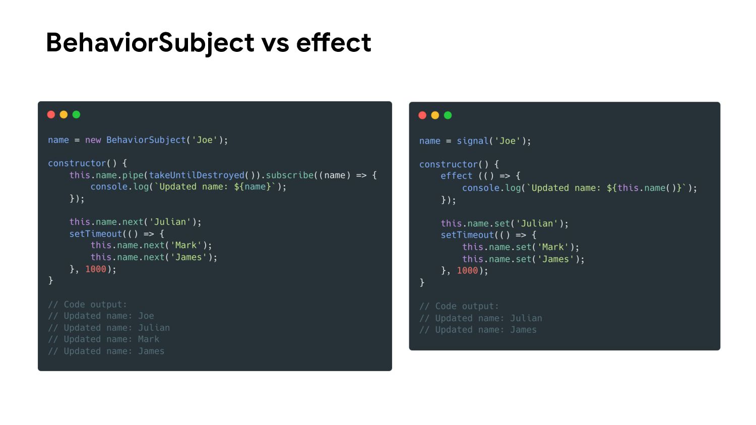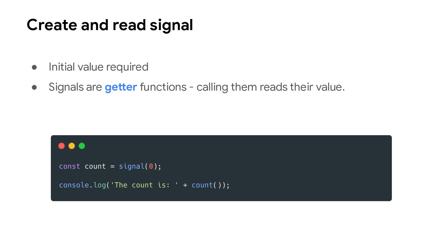 one or more signal values change • Similar to computed signals, effects keep track of their dependencies dynamically, and only track signals which were read in the most recent execution • Effects always execute asynchronously, during the change detection process • Avoid using effects for propagation of state changes.