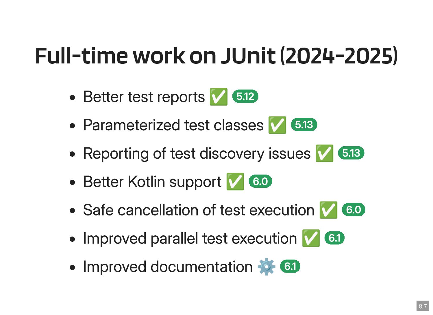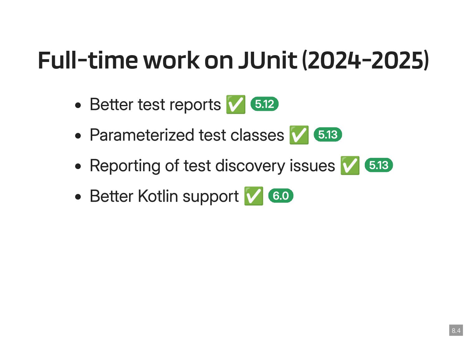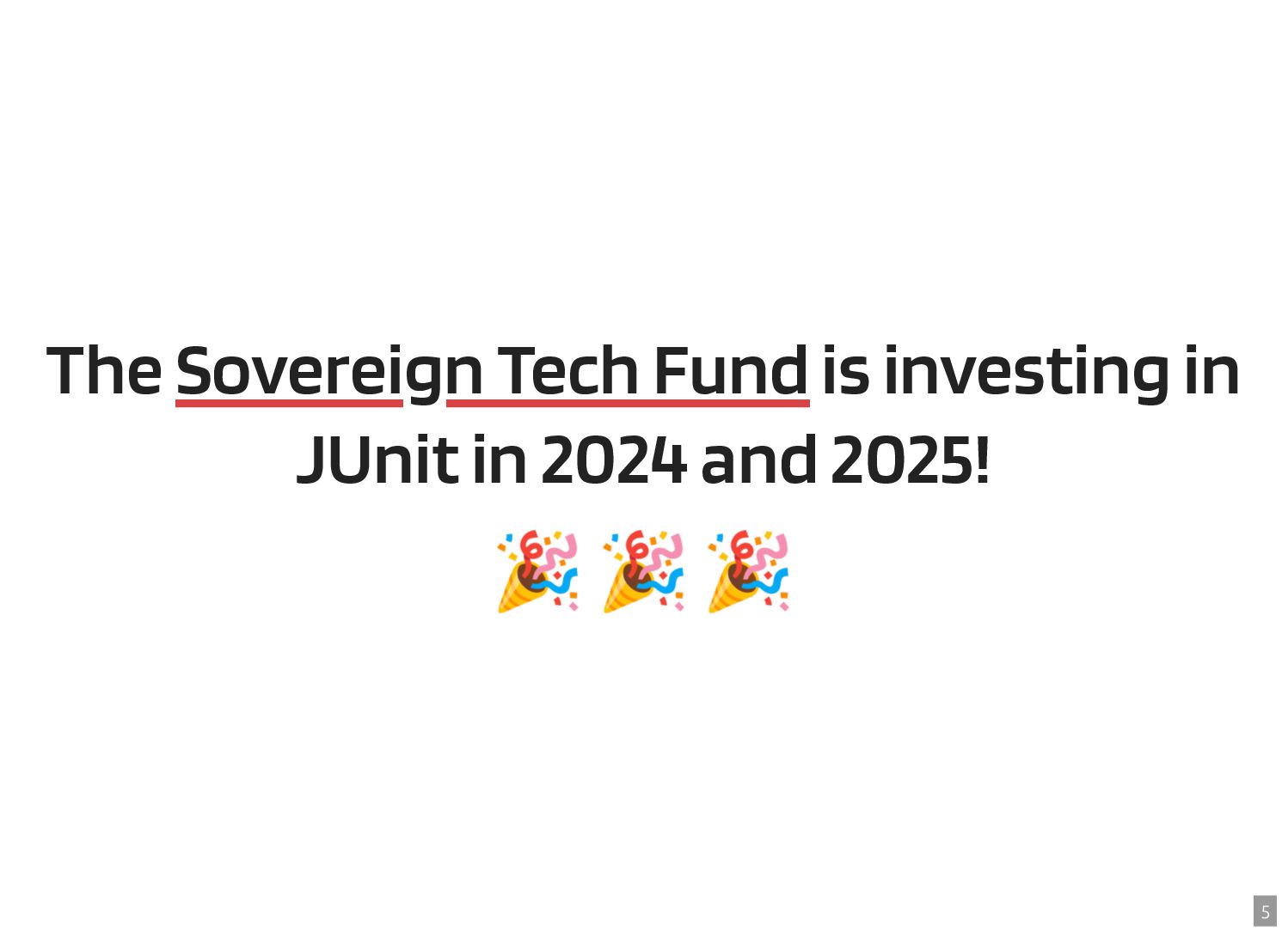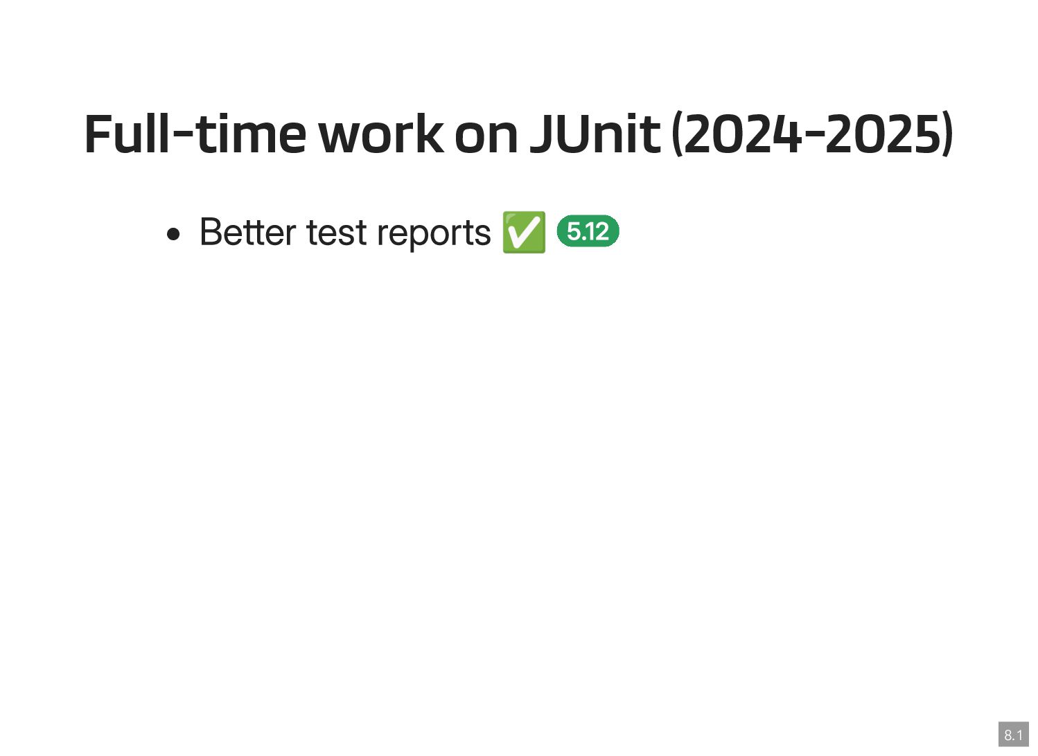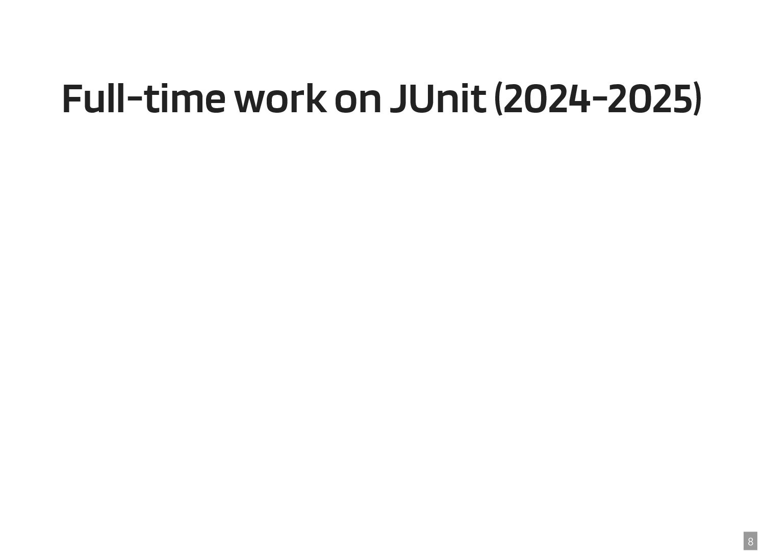 Thanks to the Sovereign Tech Fund I had the opportunity to work full-time on JUnit this year. In this talk, I‘ll report on my experiences and walk you through the new features and enhancements. Most prominently, those are Open Test Reporting, Parameterized Test Classes, Discovery Issues, and the new Java 17 and Kotlin 2.1 baselines.