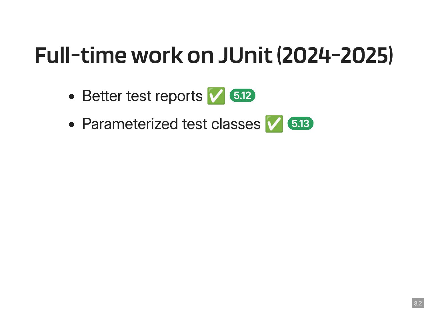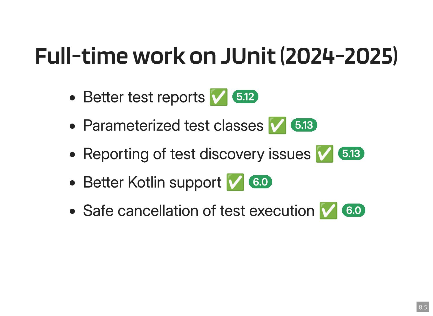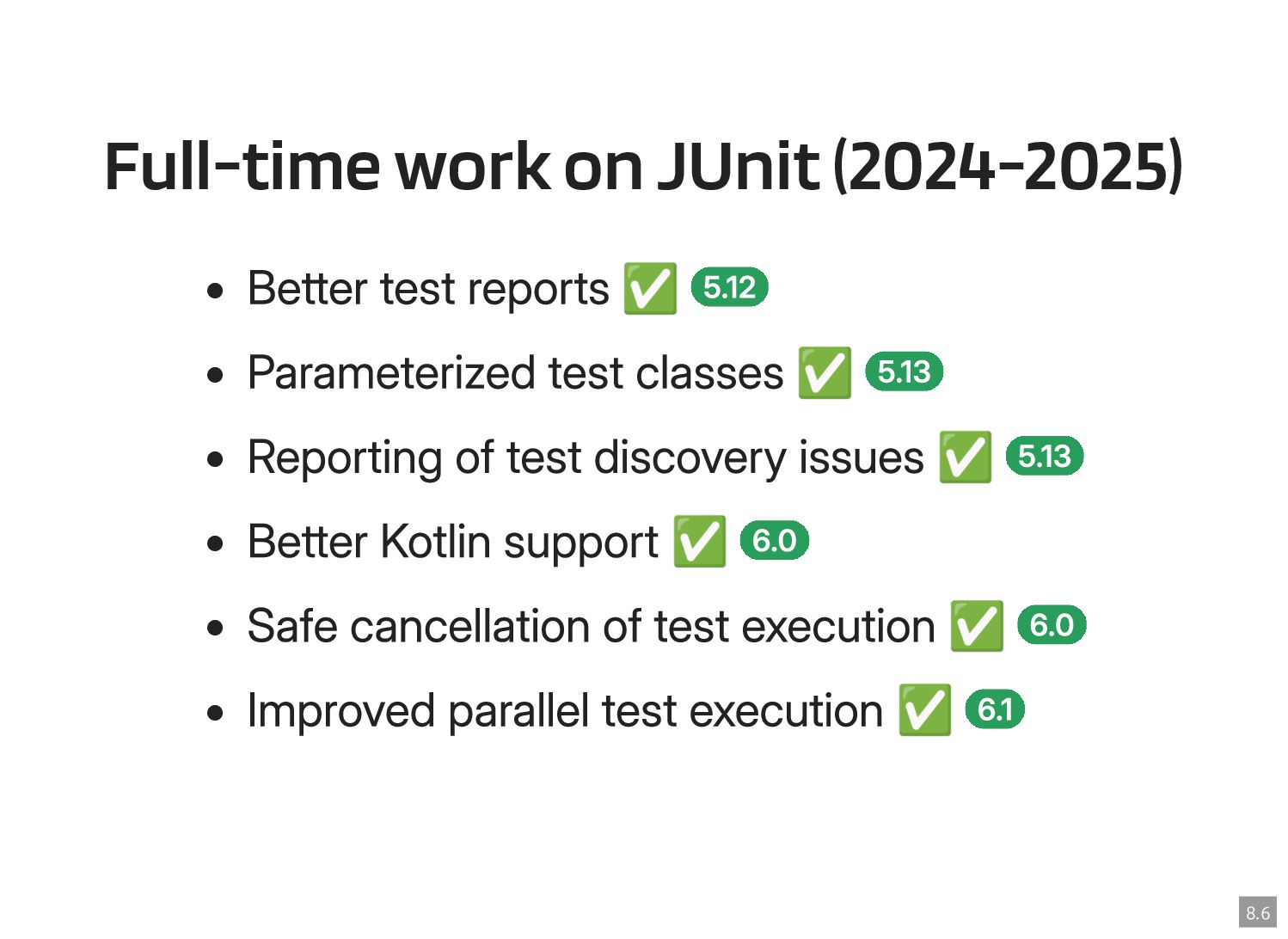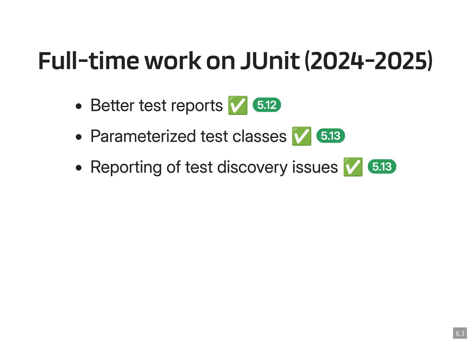 Thanks to the Sovereign Tech Fund I had the opportunity to work full-time on JUnit this year. In this talk, I‘ll report on my experiences and walk you through the new features and enhancements. Most prominently, those are Open Test Reporting, Parameterized Test Classes, Discovery Issues, and the new Java 17 and Kotlin 2.1 baselines.