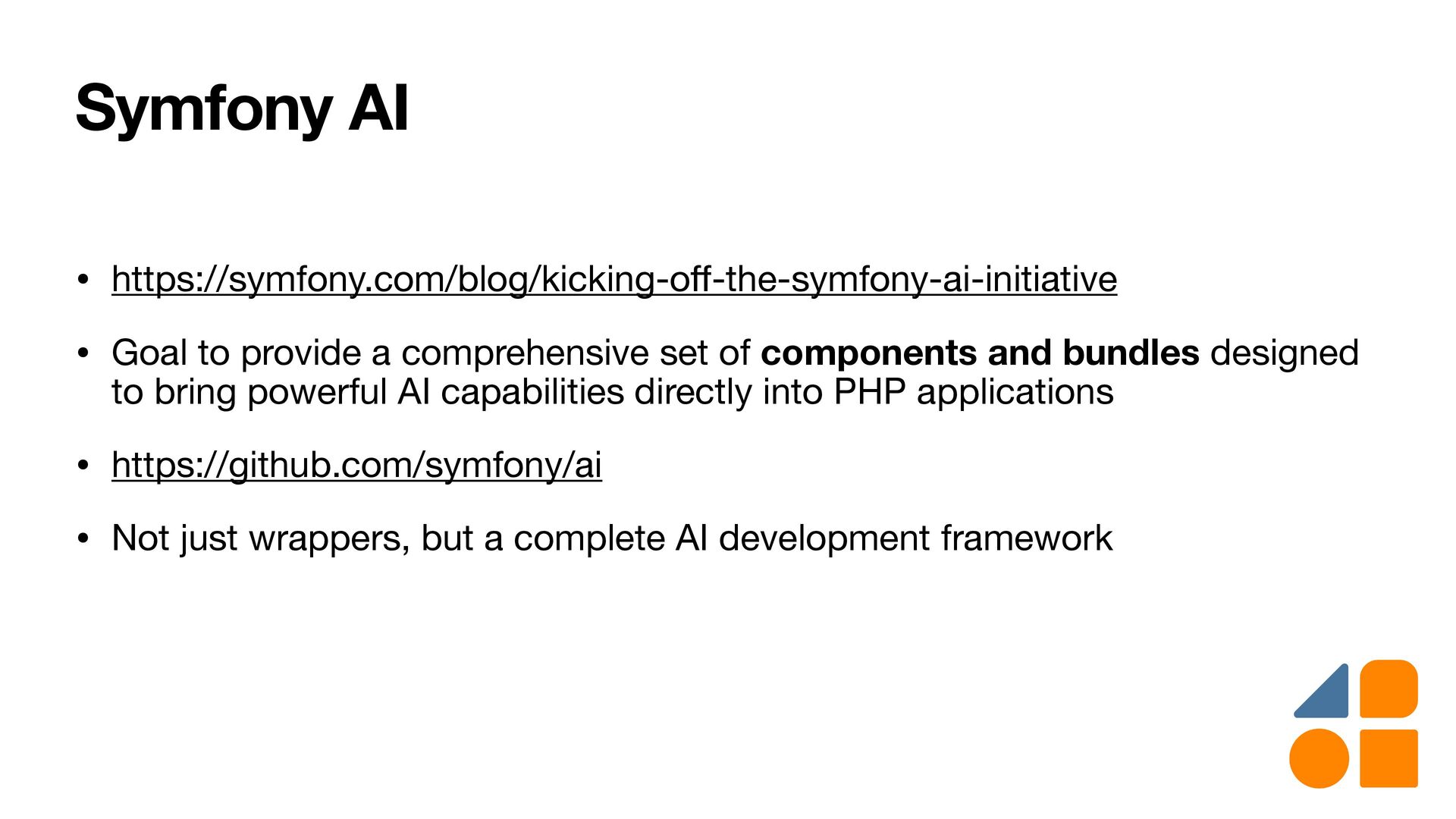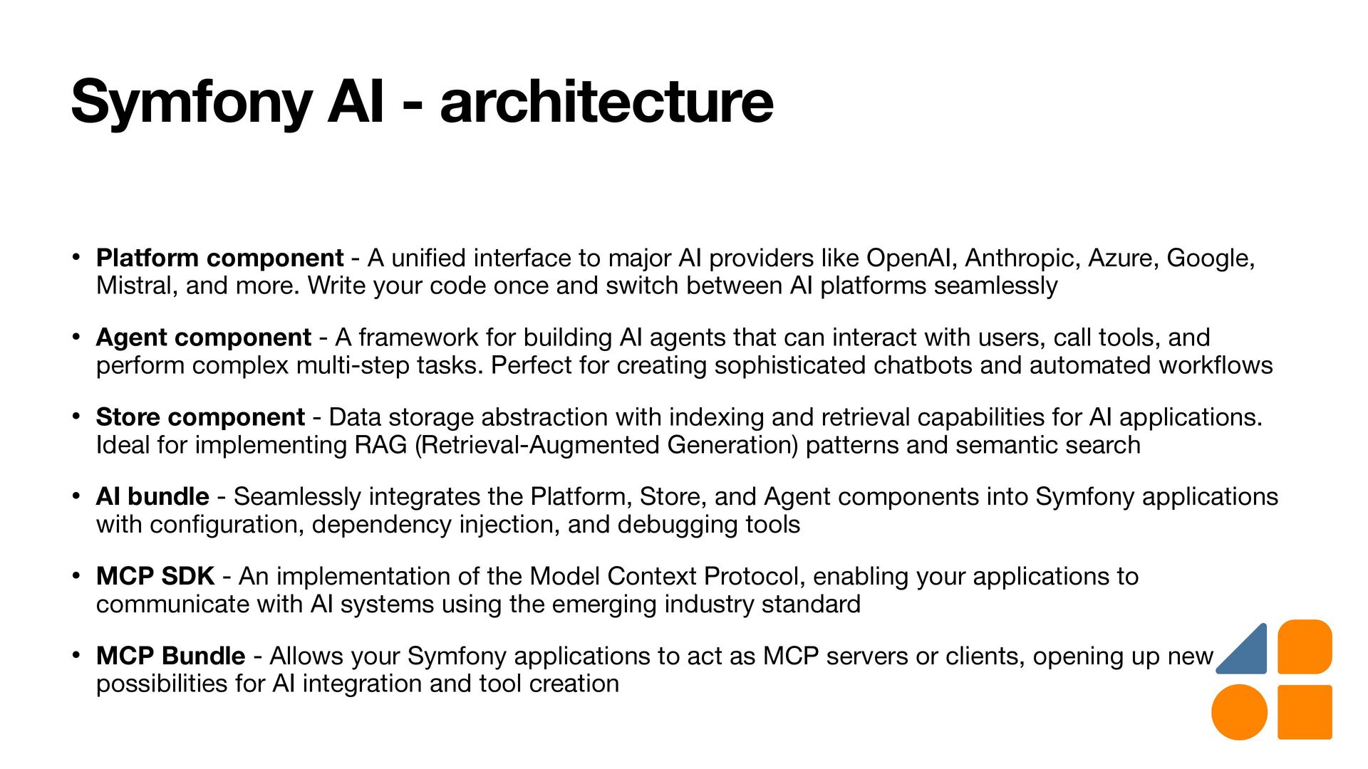 fi ed interface to major AI providers like OpenAI, Anthropic, Azure, Google, Mistral, and more. Write your code once and switch between AI platforms seamlessly • Agent component - A framework for building AI agents that can interact with users, call tools, and perform complex multi-step tasks. Perfect for creating sophisticated chatbots and automated work fl ows • Store component - Data storage abstraction with indexing and retrieval capabilities for AI applications. Ideal for implementing RAG (Retrieval-Augmented Generation) patterns and semantic search • AI bundle - Seamlessly integrates the Platform, Store, and Agent components into Symfony applications with con fi guration, dependency injection, and debugging tools • MCP SDK - An implementation of the Model Context Protocol, enabling your applications to communicate with AI systems using the emerging industry standard • MCP Bundle - Allows your Symfony applications to act as MCP servers or clients, opening up new possibilities for AI integration and tool creation