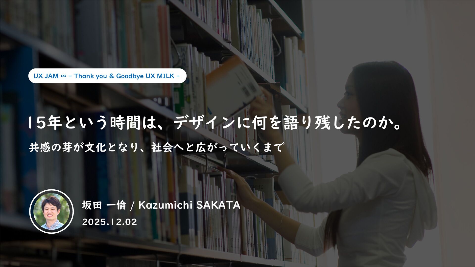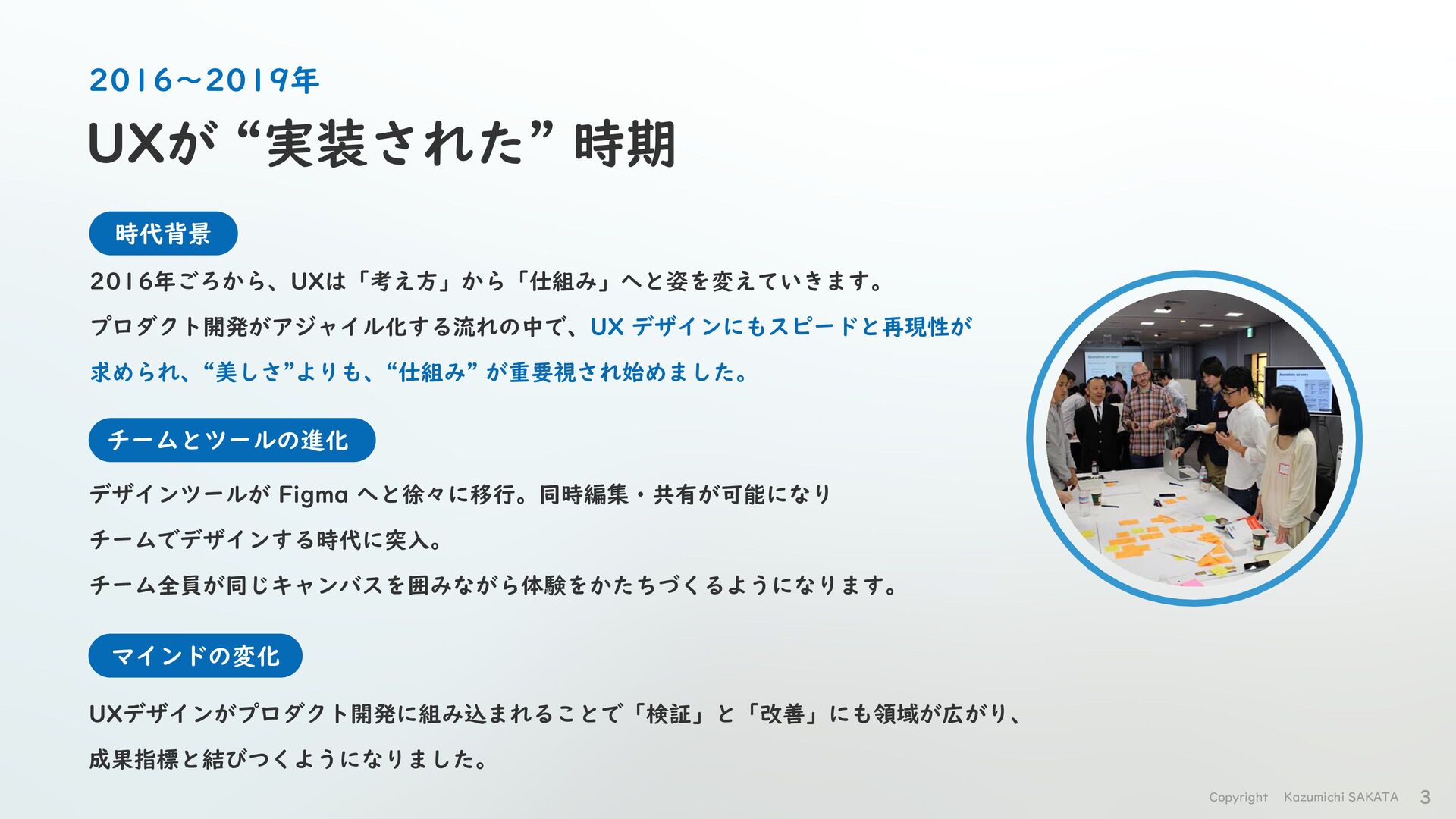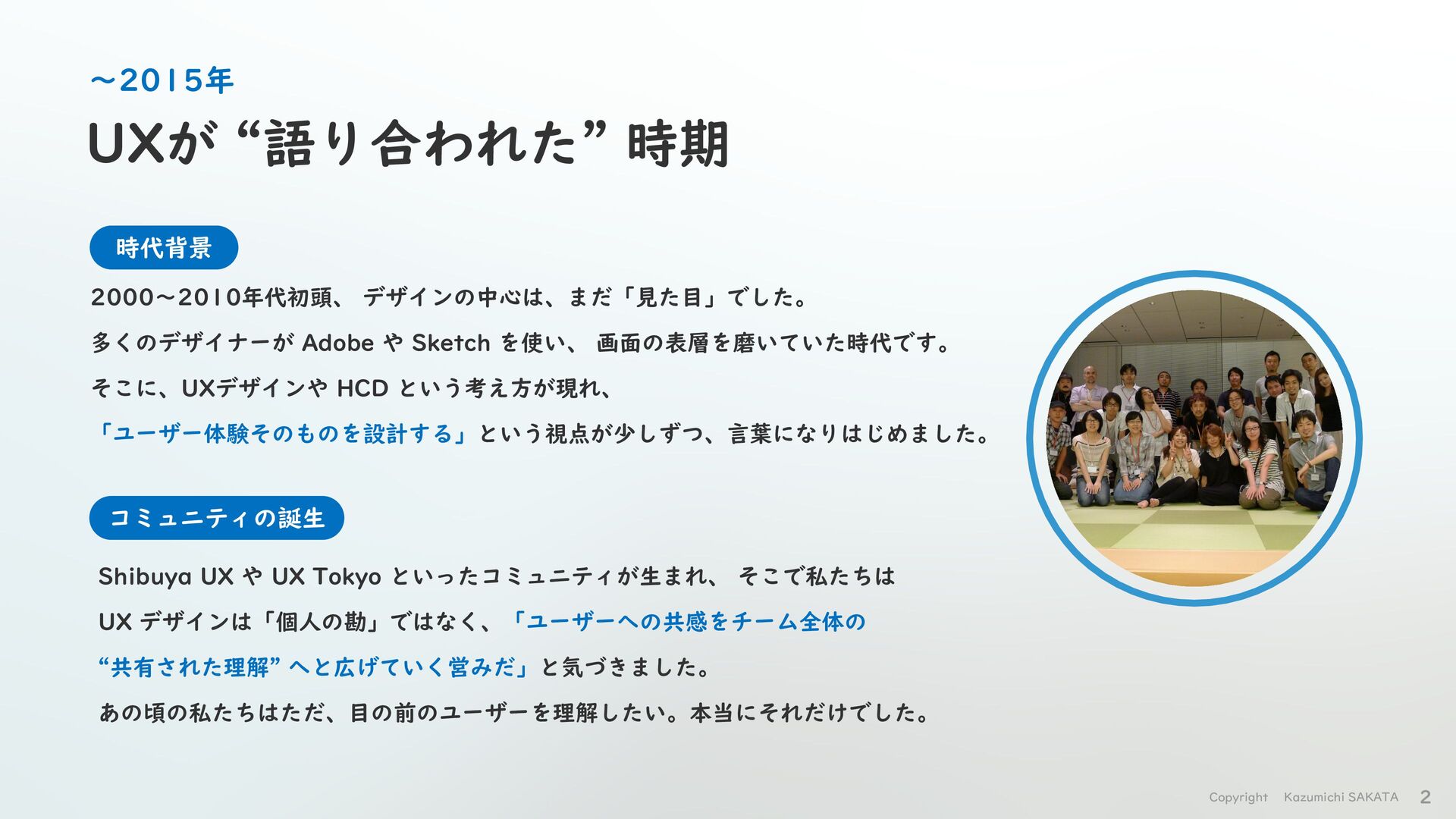 目 」でした。 多くのデザイナーが Adobe や Sketch を使い、 画 面 の表層を磨いていた時代です。 そこに、UXデザインや HCD という考え 方 が現れ、 「ユーザー体験そのものを設計する」という視点が少しずつ、 言 葉になりはじめました。 時代背景 コミュニティの誕 生 2 Copyright   Kazumichi SAKATA Shibuya UX や UX Tokyo といったコミュニティが 生 まれ、 そこで私たちは UX デザインは「個 人 の勘」ではなく、「ユーザーへの共感をチーム全体の “共有された理解” へと広げていく営みだ」と気づきました。 あの頃の私たちはただ、 目 の前のユーザーを理解したい。本当にそれだけでした。