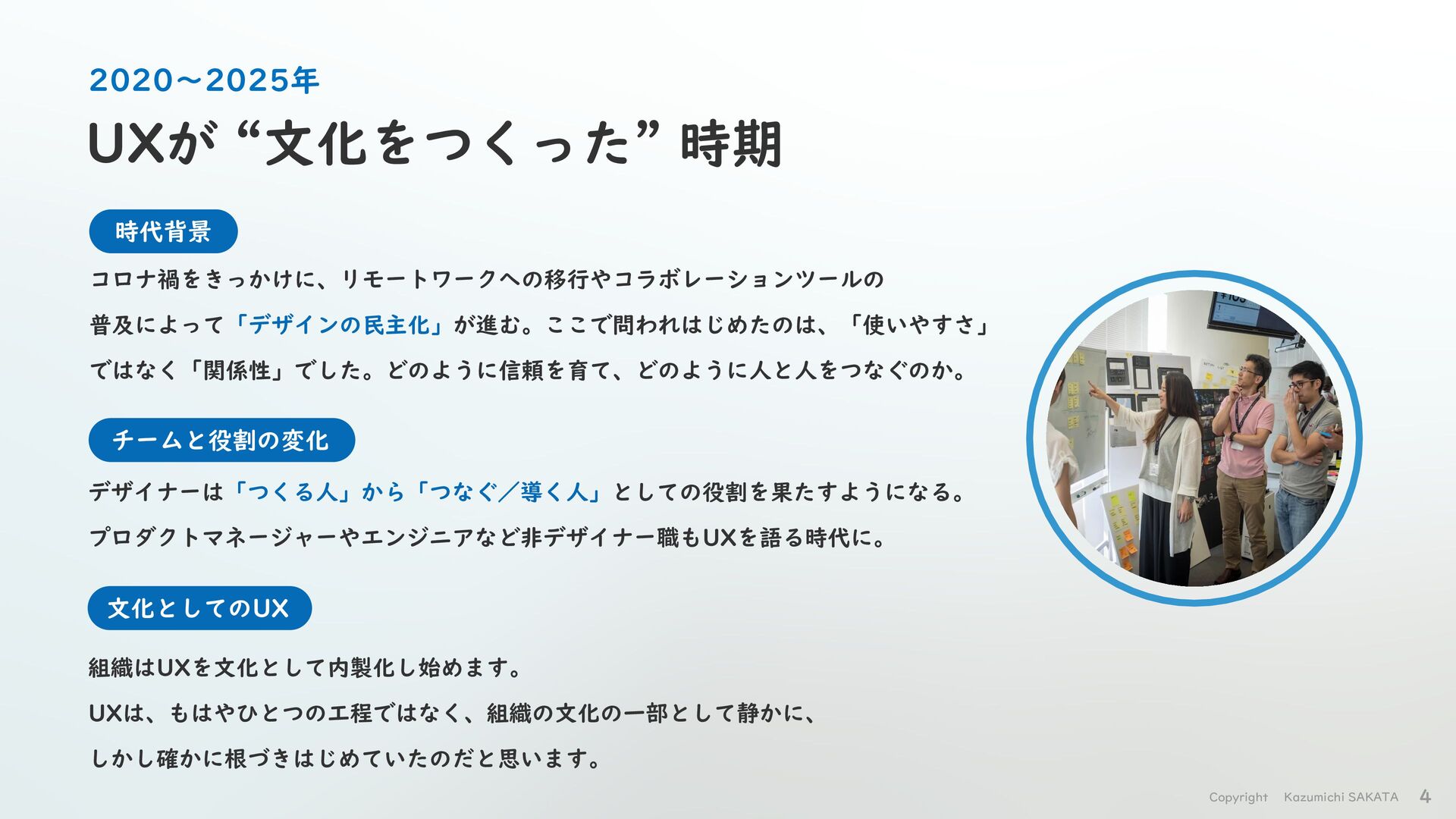 が重要視され始めました。 時代背景 チームとツールの進化 デザインツールが Figma へと徐々に移 行 。同時編集・共有が可能になり チームでデザインする時代に突 入 。 チーム全員が同じキャンバスを囲みながら体験をかたちづくるようになります。 マインドの変化 UXデザインがプロダクト開発に組み込まれることで「検証」と「改善」にも領域が広がり、 成果指標と結びつくようになりました。 3 Copyright   Kazumichi SAKATA
