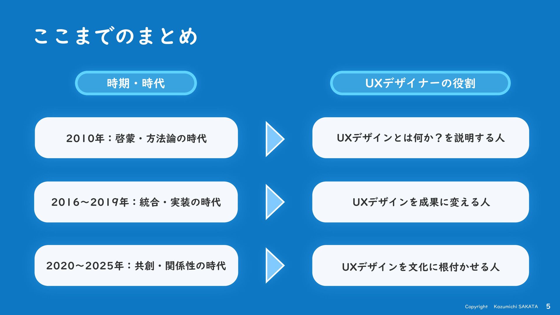 民 主化」が進む。ここで問われはじめたのは、「使いやすさ」 ではなく「関係性」でした。どのように信頼を育て、どのように 人 と 人 をつなぐのか。 時代背景 デザイナーは「つくる 人 」から「つなぐ/導く 人 」としての役割を果たすようになる。 プロダクトマネージャーやエンジニアなど 非 デザイナー職もUXを語る時代に。 文 化としてのUX 組織はUXを 文 化として内製化し始めます。 UXは、もはやひとつの 工 程ではなく、組織の 文 化の 一 部として静かに、 しかし確かに根づきはじめていたのだと思います。 チームと役割の変化 4 Copyright   Kazumichi SAKATA