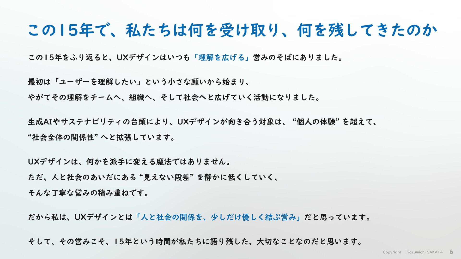 の体験” を超えて、 “社会全体の関係性” へと拡張しています。 UXデザインは、何かを派 手 に変える魔法ではありません。 ただ、 人 と社会のあいだにある “ 見 えない段差” を静かに低くしていく、 そんな丁寧な営みの積み重ねです。 だから私は、UXデザインとは「 人 と社会の関係を、少しだけ優しく結ぶ営み」だと思っています。 そして、その営みこそ、15年という時間が私たちに語り残した、 大 切なことなのだと思います。 6 Copyright   Kazumichi SAKATA