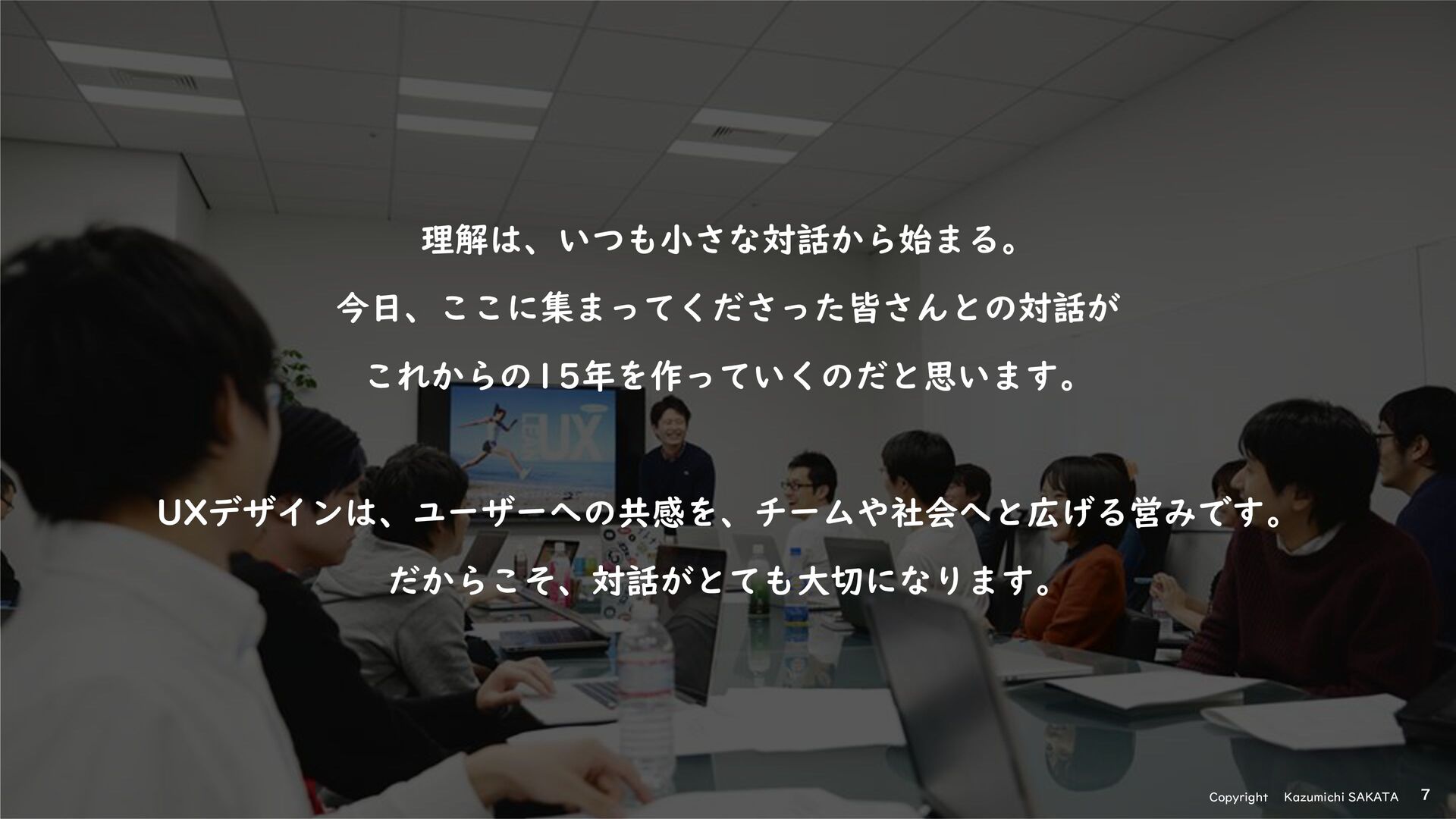 、ここに集まってくださった皆さんとの対話が これからの15年を作っていくのだと思います。 UXデザインは、ユーザーへの共感を、チームや社会へと広げる営みです。 だからこそ、対話がとても 大 切になります。