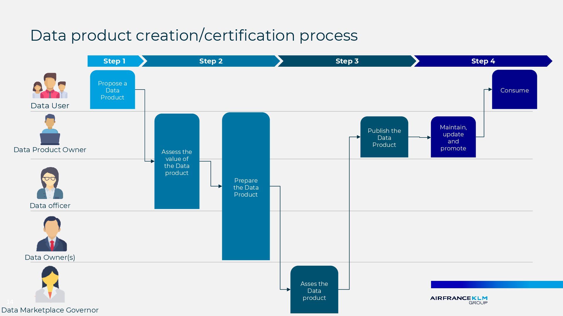 3 Step 4 Data Product Owner Data User Data Marketplace Governor Data officer Data Owner(s) Propose a Data Product Assess the value of the Data product Prepare the Data Product Maintain, update and promote Asses the Data product Publish the Data Product Consume