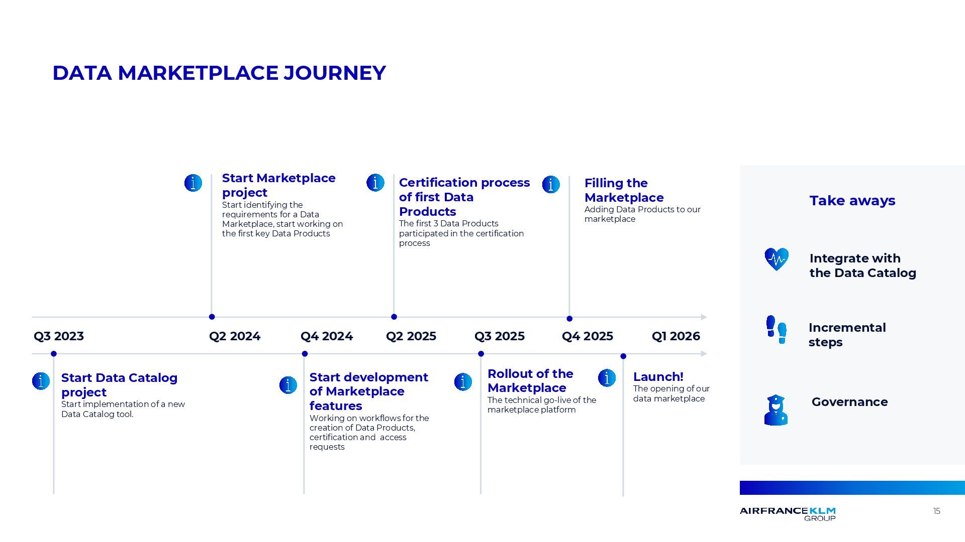 Q2 2025 Q3 2025 Q4 2025 Q1 2026 Take aways Integrate with the Data Catalog Start Marketplace project Start identifying the requirements for a Data Marketplace, start working on the first key Data Products Start Data Catalog project Start implementation of a new Data Catalog tool. Start development of Marketplace features Working on workflows for the creation of Data Products, certification and access requests Incremental steps Governance Certification process of first Data Products The first 3 Data Products participated in the certification process Rollout of the Marketplace The technical go-live of the marketplace platform Filling the Marketplace Adding Data Products to our marketplace Launch! The opening of our data marketplace