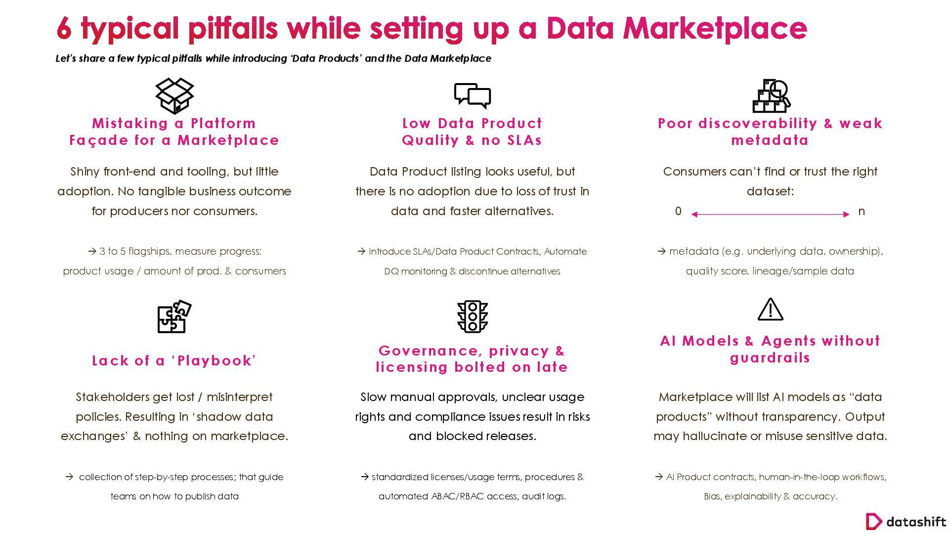 program like Data Maturity, Data Quality, Regulatory Compliance, Privacy & Data security,… Let’s focus on a few more concrete features that can help to embed your Data Marketplace. 6 typical pitfalls while setting up a Data Marketplace Lack of a ‘Playbook’ Stakeholders get lost / misinterpret policies. Resulting in ‘shadow data exchanges’ and no input for the marketplace. → collection of step-by-step processes; that guide teams on how to publish data Governance, privacy & licensing bolted on late Slow manual approvals, unclear usage rights and compliance issues result in risks and blocked releases. → standardized licenses/usage terms, procedures & automated ABAC/RBAC access, audit logs. Low Data Product Quality & no SLAs Data Product listing looks useful, but there is no adoption due to loss of trust in data and faster alternatives. → Introduce SLAs/Data Product Contracts, Automate DQ monitoring & discontinue alternatives Poor discoverability & weak metadata Consumers can’t find or trust the right dataset: 0 n → mandatory metadata (e.g. underlying data, ownership,…), quality score, lineage/sample data,… Mistaking a Platform Façade for a Marketplace Shiny front-end and tooling, but little adoption. No tangible business outcome for producers nor consumers. → 3 to 5 flagships, measure progress in usage: product usage / amount of producers & consumers AI Models & Agents without guardrails Marketplace will list AI models as “data products” without transparency. Output may hallucinate or use sensitive data incorrectly. → Introduce AI Product contracts, human-in-the-loop workflows for use cases. Bias, explainability and accuracy testing before publishing. There are a lot of important topics that impact your program like Data Maturity, Data Quality, Regulatory Compliance, Privacy & Data security,… Let’s focus on a few more concrete features that can help to embed your Data Marketplace. Other related topics • Translate into Business language • Tailor to Stakeholder’s Roles • Continuous, not one-off Communication Focus • 1 clear & consistent story • translated into concrete steps (playbook) • Ambitious & realistic Team • Smart & multidisciplinary team you trust • From vision to execution • Establish a Shared Vocabulary and Principle & 3 concrete tips