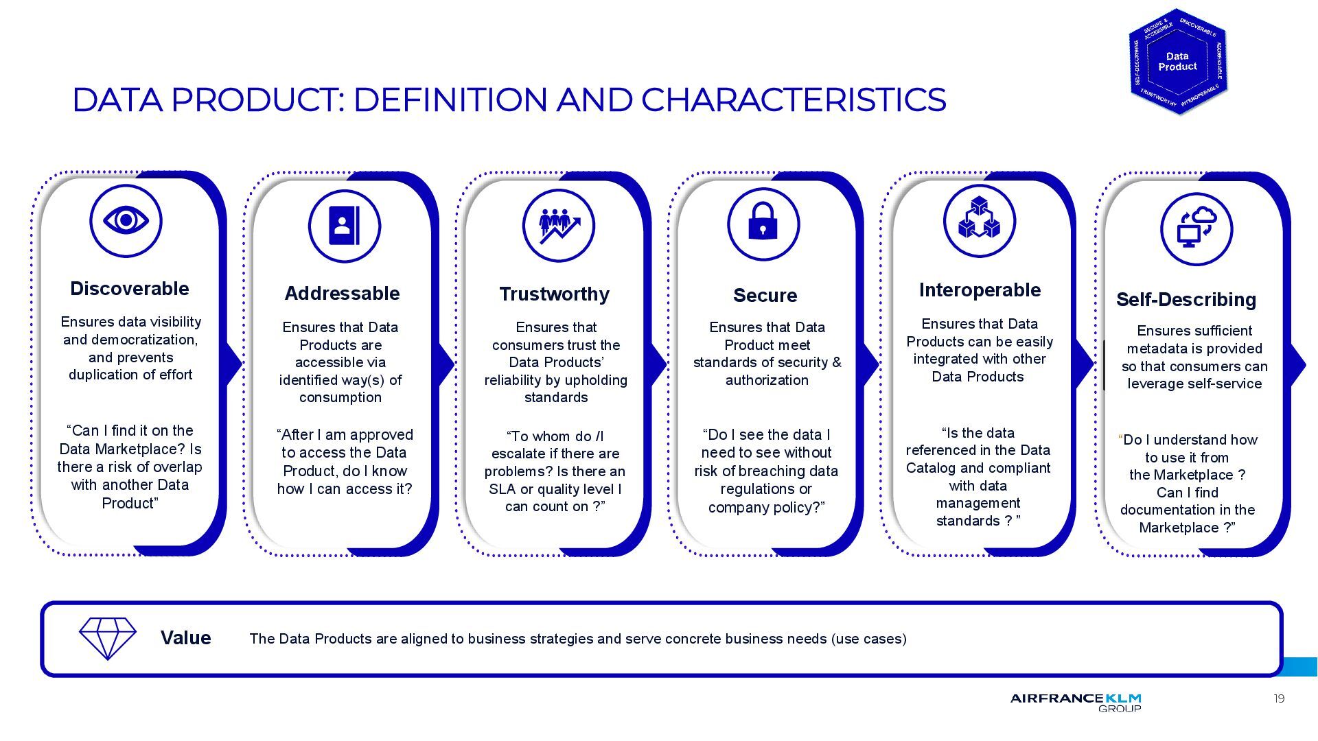 it on the Data Marketplace? Is there a risk of overlap with another Data Product” Ensures data visibility and democratization, and prevents duplication of effort Addressable “After I am approved to access the Data Product, do I know how I can access it? Ensures that Data Products are accessible via identified way(s) of consumption Trustworthy “To whom do /I escalate if there are problems? Is there an SLA or quality level I can count on ?” Ensures that consumers trust the Data Products’ reliability by upholding standards Secure “Do I see the data I need to see without risk of breaching data regulations or company policy?” Ensures that Data Product meet standards of security & authorization Self-Describing “Do I understand how to use it from the Marketplace ? Can I find documentation in the Marketplace ?” Ensures sufficient metadata is provided so that consumers can leverage self-service The Data Products are aligned to business strategies and serve concrete business needs (use cases) Value Interoperable “Is the data referenced in the Data Catalog and compliant with data management standards ? ” Ensures that Data Products can be easily integrated with other Data Products