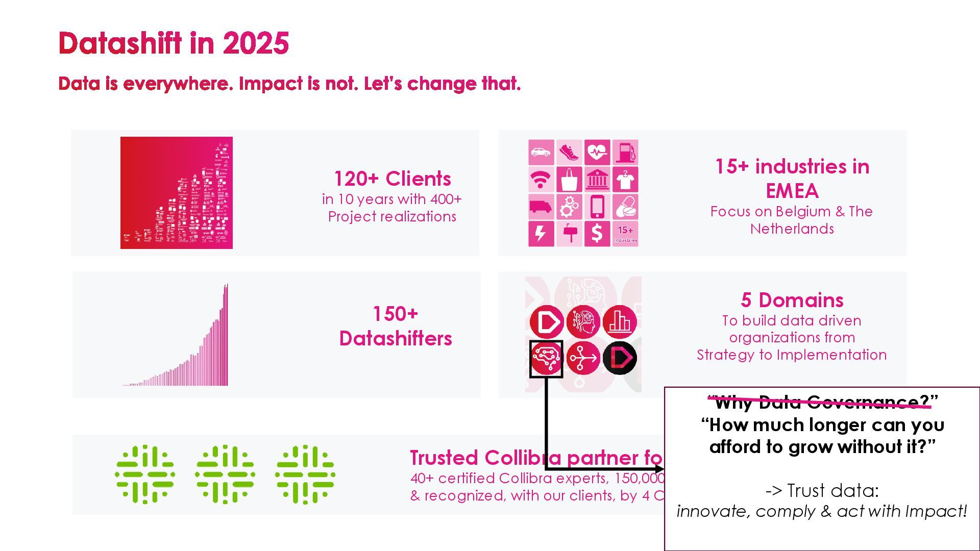 in 2025 120+ Clients in 10 years with 400+ Project realizations 150+ Datashifters 15+ industries in EMEA Focus on Belgium & The Netherlands 5 Domains To build data driven organizations from Strategy to Implementation Trusted Collibra partner for 9+ years 40+ certified Collibra experts, 150,000 hours of hands-on experience & recognized, with our clients, by 4 Collibra Excellence Awards “Why Data Governance?” “How much longer can you afford to grow without it?” -> Trust data: innovate, comply & act with Impact!