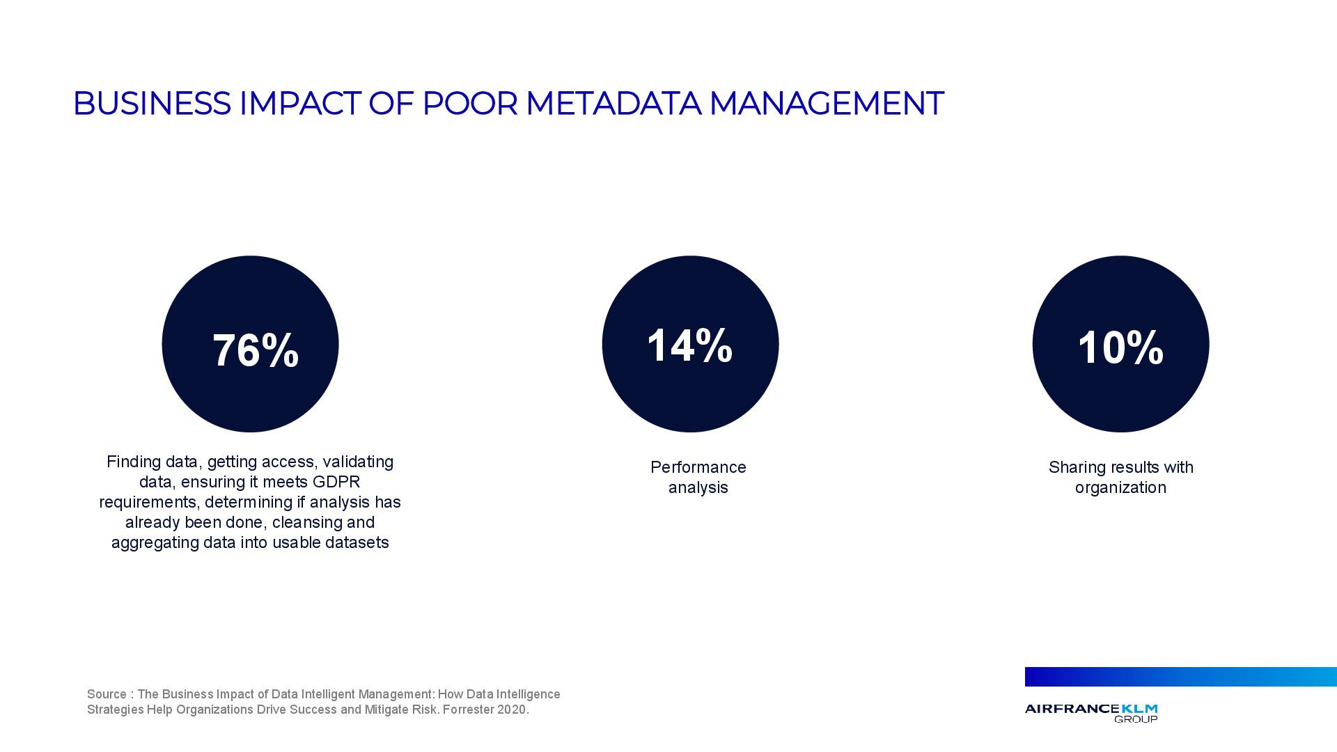Data Intelligence Strategies Help Organizations Drive Success and Mitigate Risk. Forrester 2020. Finding data, getting access, validating data, ensuring it meets GDPR requirements, determining if analysis has already been done, cleansing and aggregating data into usable datasets 76% Performance analysis 14% Sharing results with organization 10% BUSINESS IMPACT OF POOR METADATA MANAGEMENT 6
