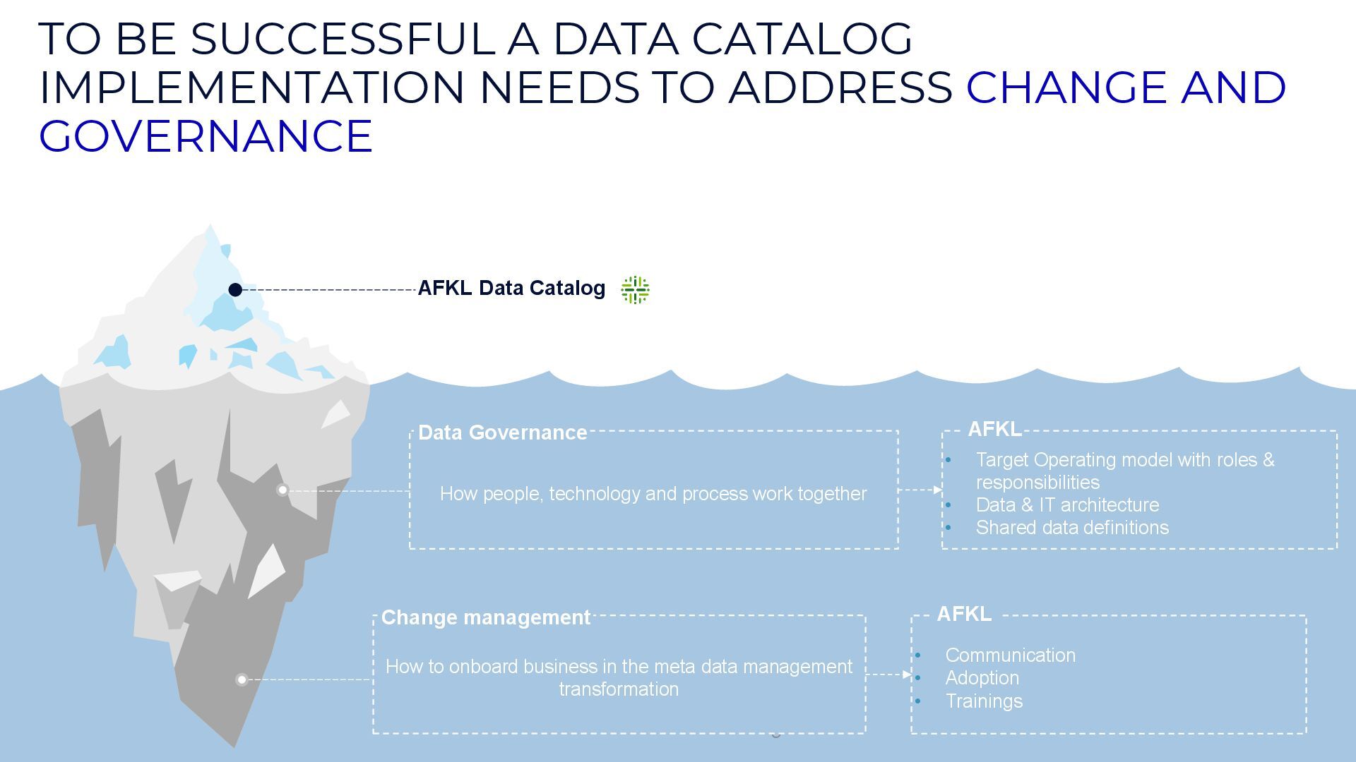 together Data Governance How to onboard business in the meta data management transformation Change management TO BE SUCCESSFUL A DATA CATALOG IMPLEMENTATION NEEDS TO ADDRESS CHANGE AND GOVERNANCE • Target Operating model with roles & responsibilities • Data & IT architecture • Shared data definitions AFKL • Communication • Adoption • Trainings AFKL