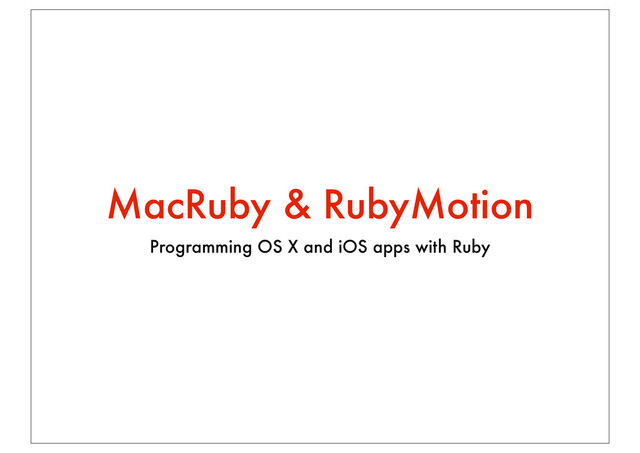 top of the Objective-C runtime and garbage collection (libauto) Based on Ruby 1.9 Uses LLVM and supports both ahead-of-time and just-in-time compilation Ships with OS X 10.7 Lion!!