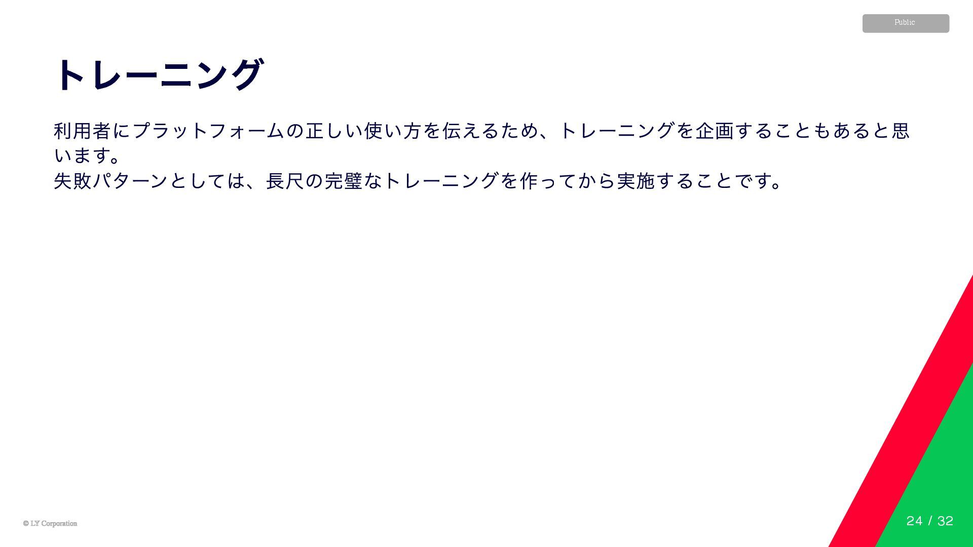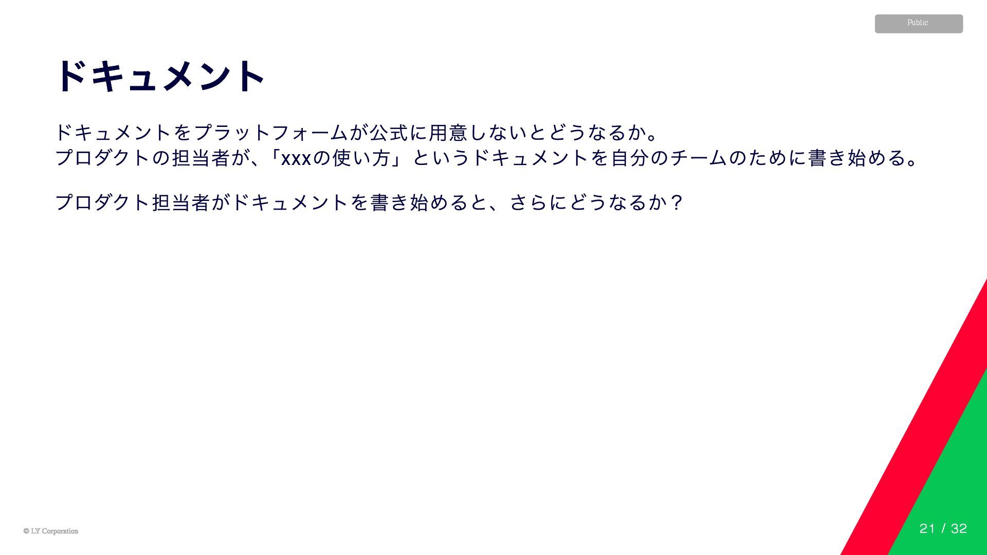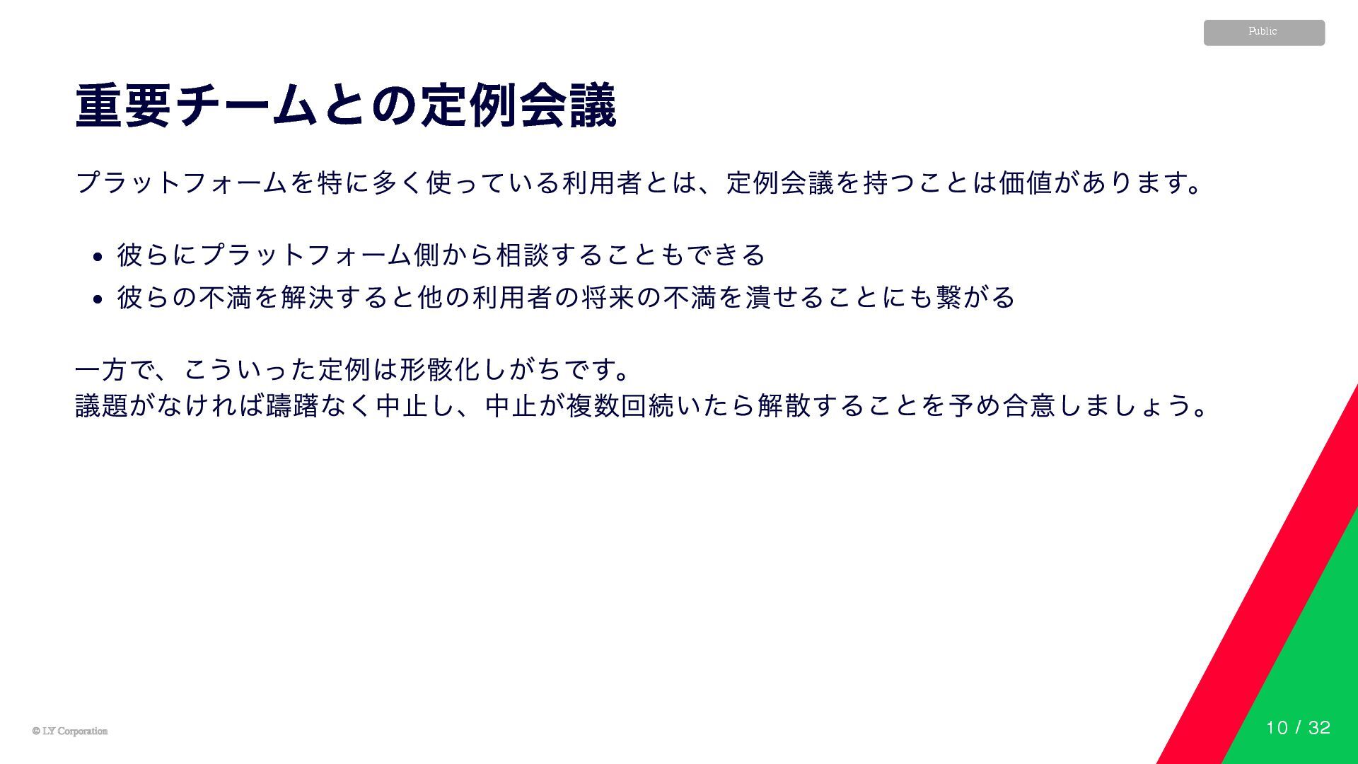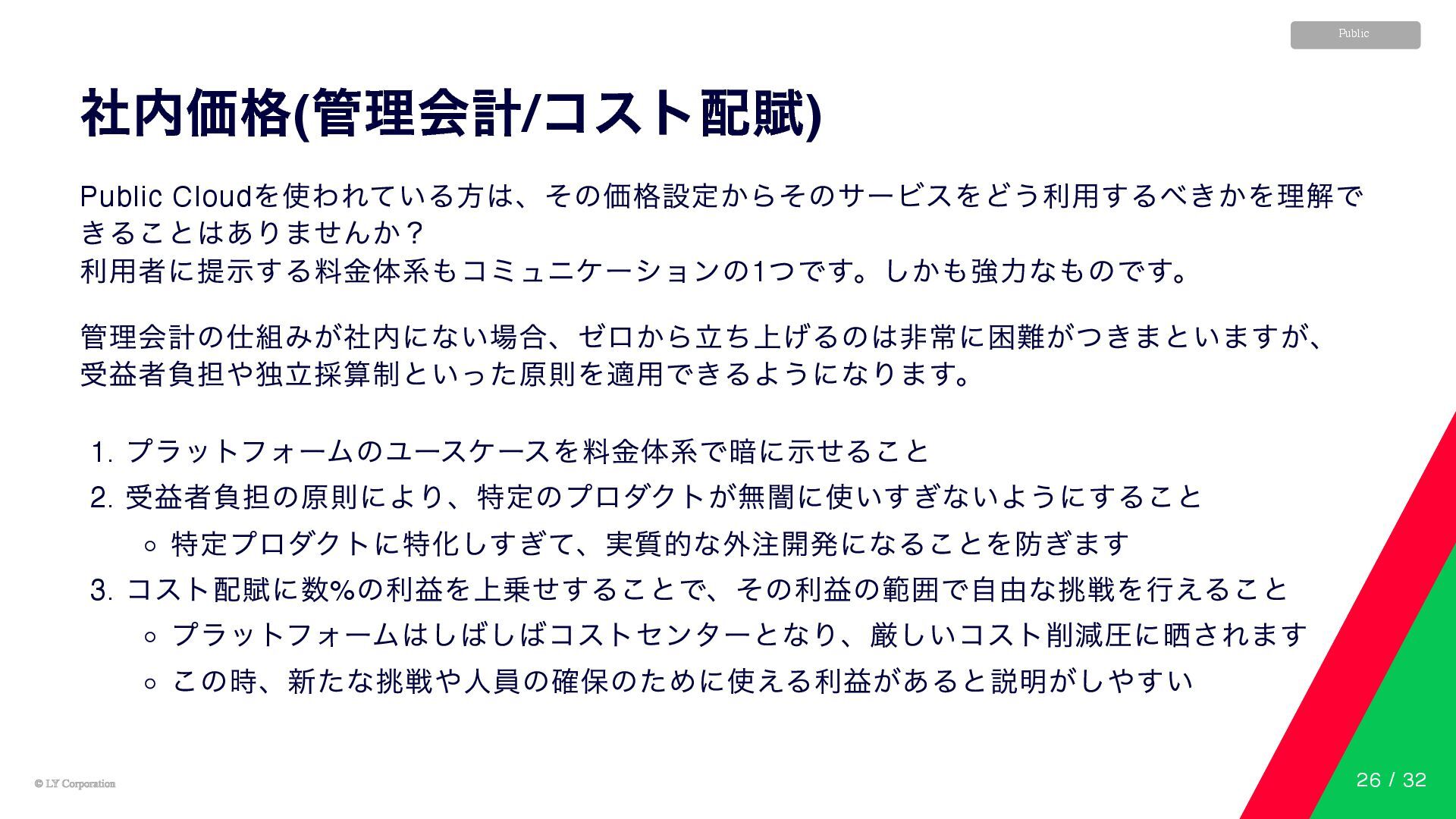 Public Cloud を使われている方は、その価格設定からそのサービスをどう利用するべきかを理解で きることはありませんか? 利用者に提示する料金体系もコミュニケーションの1 つです。しかも強力なものです。 管理会計の仕組みが社内にない場合、ゼロから立ち上げるのは非常に困難がつきまといますが、 受益者負担や独立採算制といった原則を適用できるようになります。 1. プラットフォームのユースケースを料金体系で暗に示せること 2. 受益者負担の原則により、特定のプロダクトが無闇に使いすぎないようにすること 特定プロダクトに特化しすぎて、実質的な外注開発になることを防ぎます 3. コスト配賦に数% の利益を上乗せすることで、その利益の範囲で自由な挑戦を行えること プラットフォームはしばしばコストセンターとなり、厳しいコスト削減圧に晒されます この時、新たな挑戦や人員の確保のために使える利益があると説明がしやすい 26 / 32