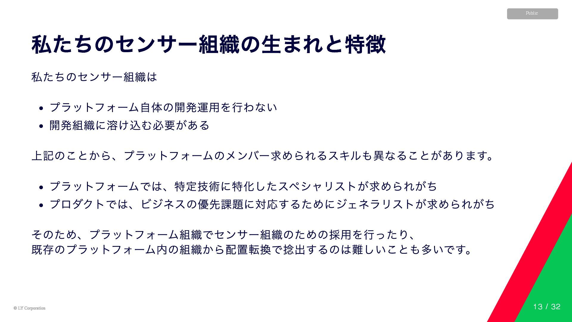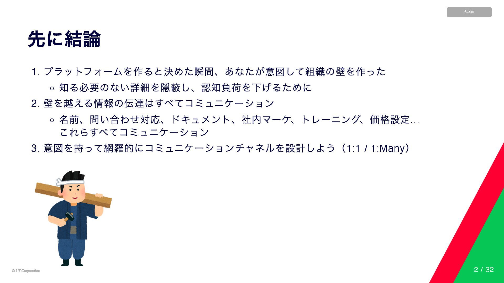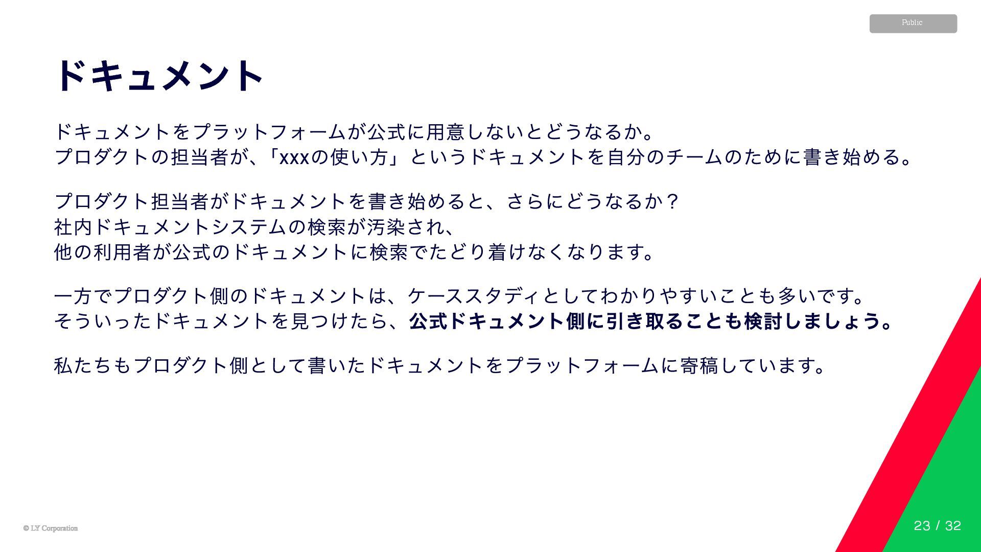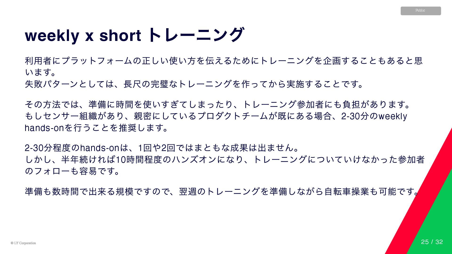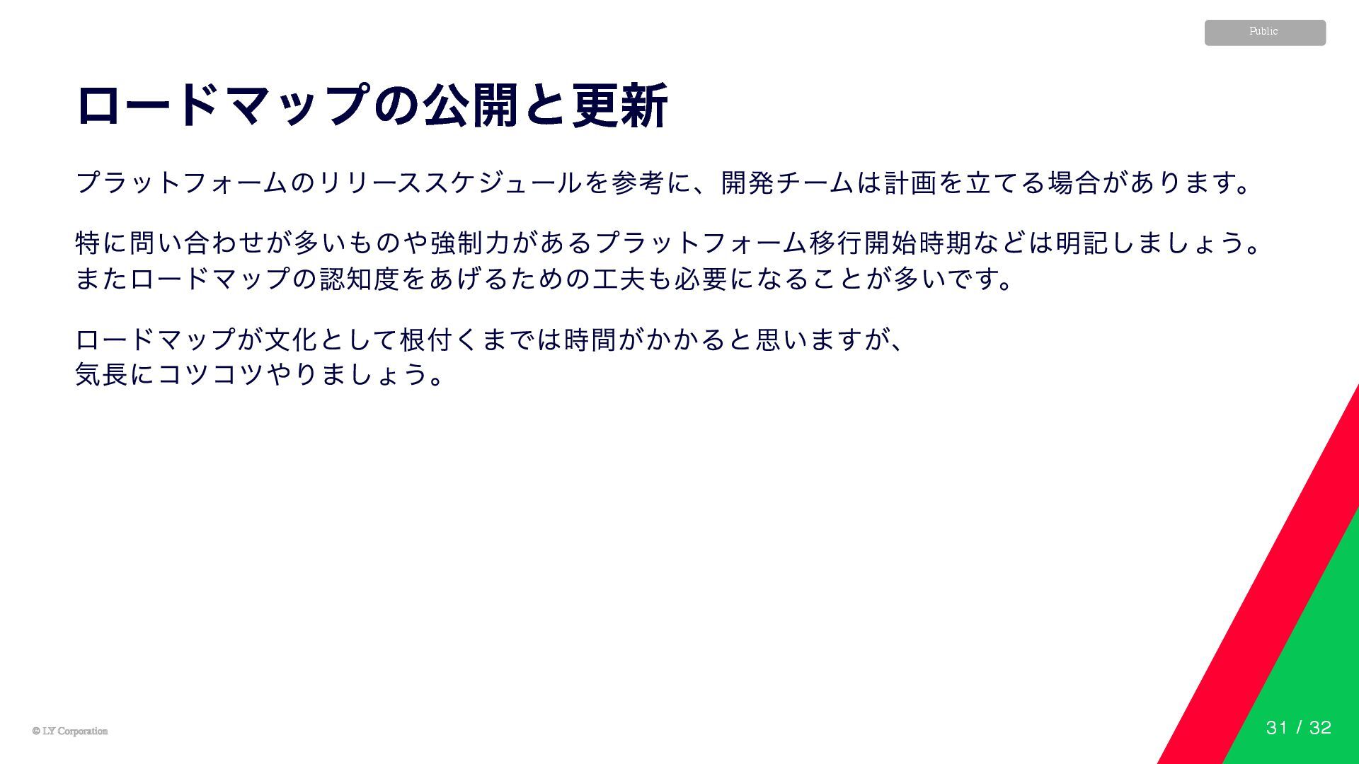 Public Cloud を使われている方は、その価格設定からそのサービスをどう利用するべきかを理解で きることはありませんか? 利用者に提示する料金体系もコミュニケーションの1 つです。しかも強力なものです。 管理会計の仕組みが社内にない場合、ゼロから立ち上げるのは非常に困難がつきまといますが、 受益者負担や独立採算制といった原則を適用できるようになります。 1. プラットフォームのユースケースを料金体系で暗に示せること 2. 受益者負担の原則により、特定のプロダクトが無闇に使いすぎないようにすること 特定プロダクトに特化しすぎて、実質的な外注開発になることを防ぎます 3. コスト配賦に数% の利益を上乗せすることで、その利益の範囲で自由な挑戦を行えること プラットフォームはしばしばコストセンターとなり、厳しいコスト削減圧に晒されます この時、新たな挑戦や人員の確保のために使える利益があると説明がしやすい 26 / 32