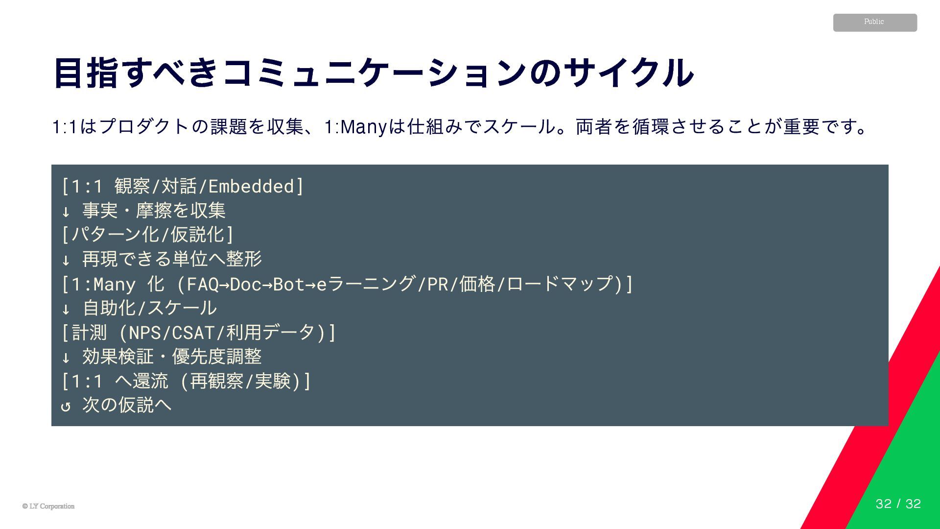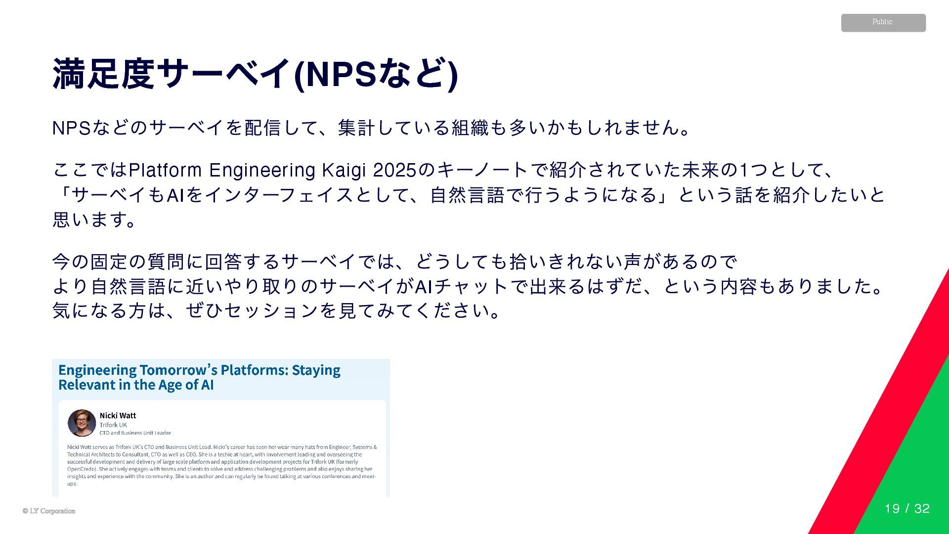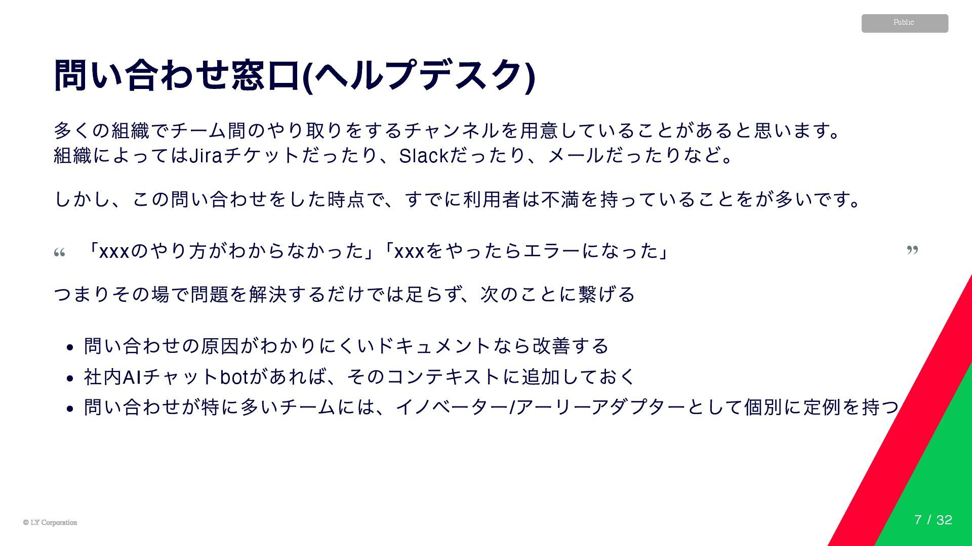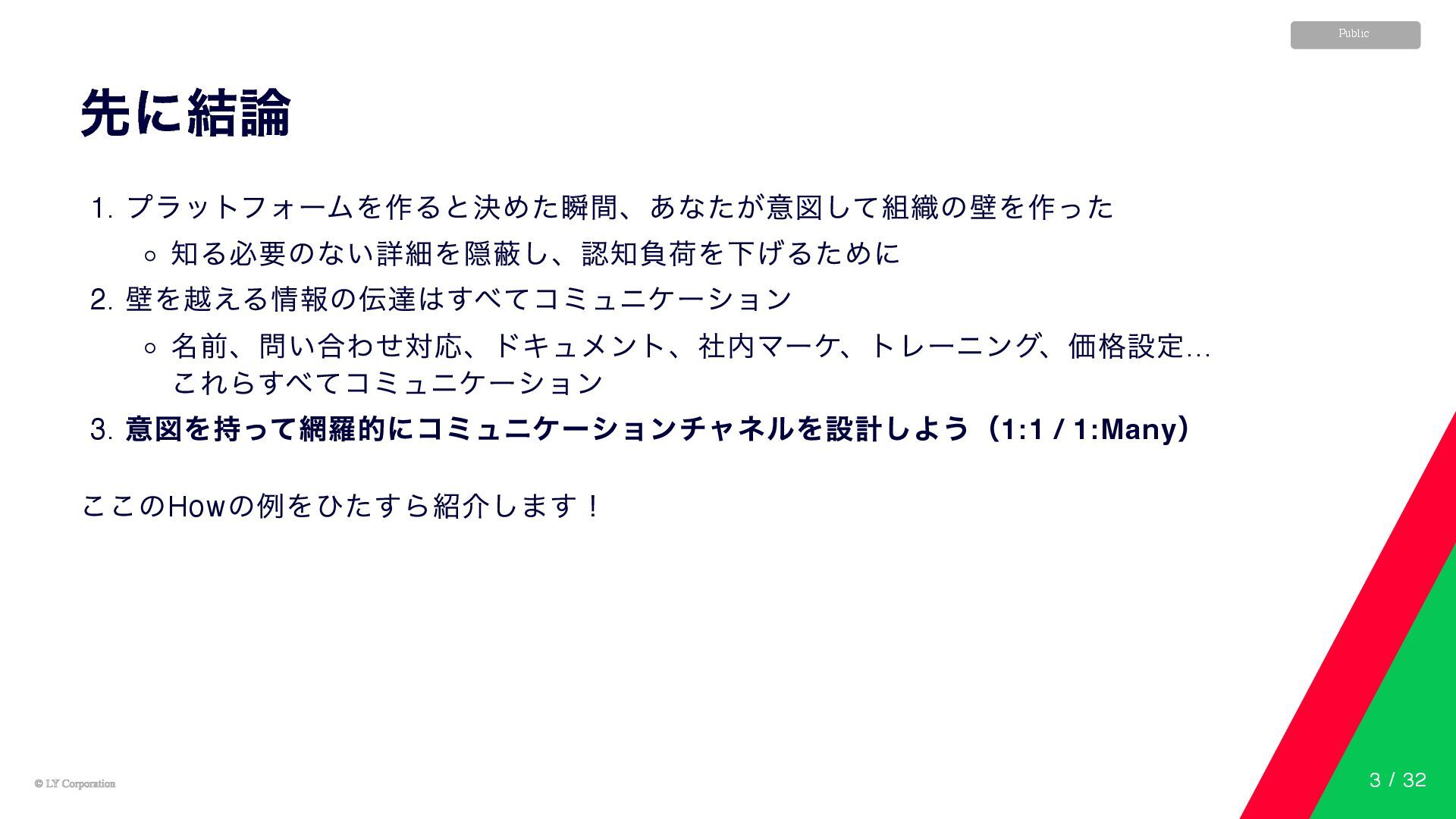 Public Cloud を使われている方は、その価格設定からそのサービスをどう利用するべきかを理解で きることはありませんか? 利用者に提示する料金体系もコミュニケーションの1 つです。しかも強力なものです。 管理会計の仕組みが社内にない場合、ゼロから立ち上げるのは非常に困難がつきまといますが、 受益者負担や独立採算制といった原則を適用できるようになります。 1. プラットフォームのユースケースを料金体系で暗に示せること 2. 受益者負担の原則により、特定のプロダクトが無闇に使いすぎないようにすること 特定プロダクトに特化しすぎて、実質的な外注開発になることを防ぎます 3. コスト配賦に数% の利益を上乗せすることで、その利益の範囲で自由な挑戦を行えること プラットフォームはしばしばコストセンターとなり、厳しいコスト削減圧に晒されます この時、新たな挑戦や人員の確保のために使える利益があると説明がしやすい 26 / 32