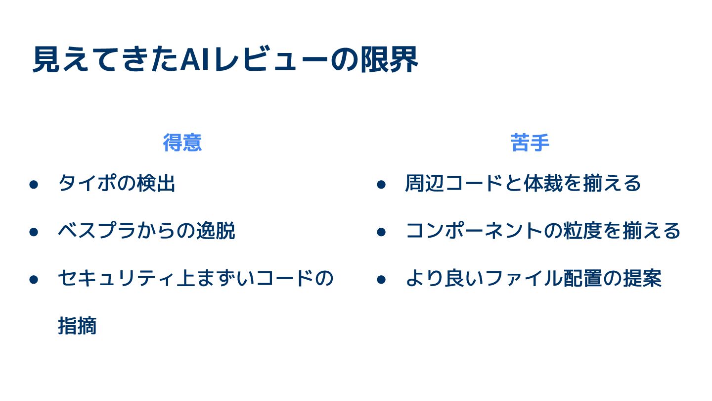 見えてきたAIレビューの限界 得意 • タイポの検出 • ベスプラからの逸脱 • セキュリティ上まずいコードの 指摘 苦手