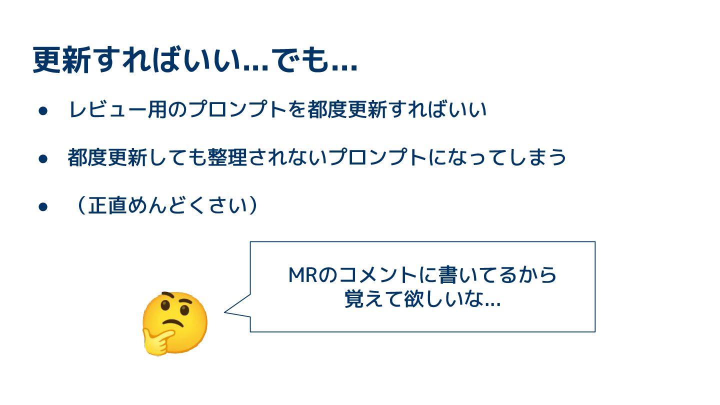 更新すればいい...でも... • レビュー用のプロンプトを都度更新すればいい • 都度更新しても整理されないプロンプトになってしまう • (正直めんどくさい) MRのコメントに書いてるから 覚えて欲しいな... 🤔