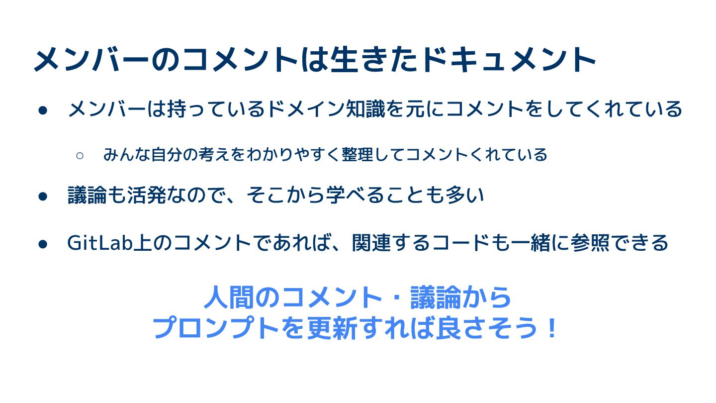 メンバーのコメントは生きたドキュメント • メンバーは持っているドメイン知識を元にコメントをしてくれている ◦ みんな自分の考えをわかりやすく整理してコメントくれている • 議論も活発なので、そこから学べることも多い • GitLab上のコメントであれば、関連するコードも一緒に参照できる 人間のコメント・議論から