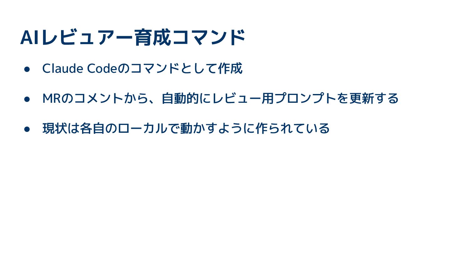 AIレビュアー育成コマンド • Claude Codeのコマンドとして作成 • MRのコメントから、自動的にレビュー用プロンプトを更新する • 現状は各自のローカルで動かすように作られている