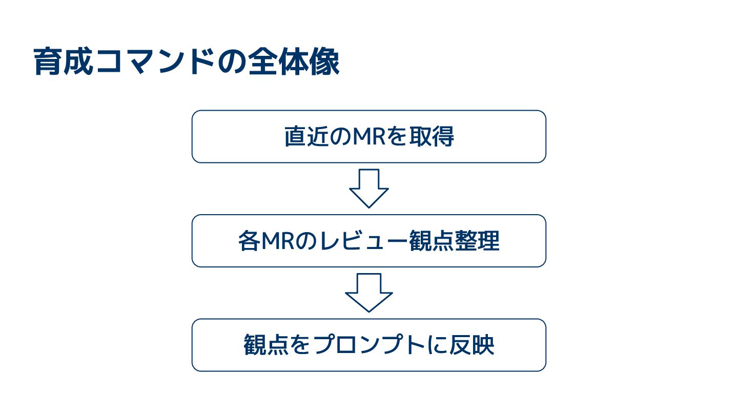 育成コマンドの全体像 直近のMRを取得 各MRのレビュー観点整理 観点をプロンプトに反映