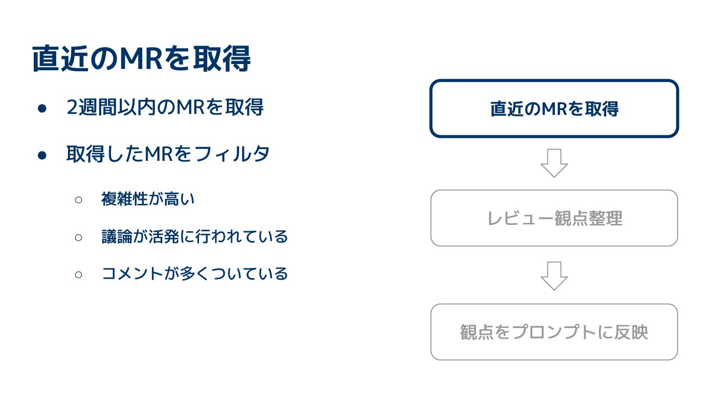 コメントが多くついている 直近のMRを取得 観点をプロンプトに反映 レビュー観点整理