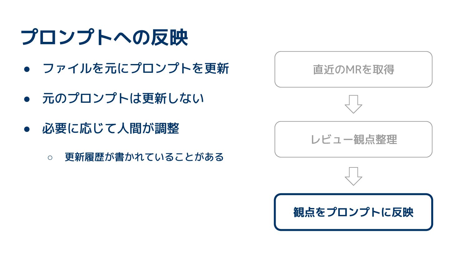 プロンプトへの反映 直近のMRを取得 観点をプロンプトに反映 レビュー観点整理 • ファイルを元にプロンプトを更新 • 元のプロンプトは更新しない • 必要に応じて人間が調整