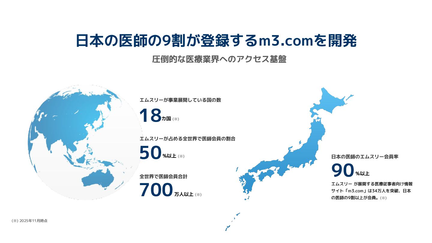 (※) 2025年11月時点 日本の医師のエムスリー会員率 エムスリーが事業展開している国の数 エムスリーが占める全世界で医師会員の割合 全世界で医師会員合計 18 カ国 (※) 50
