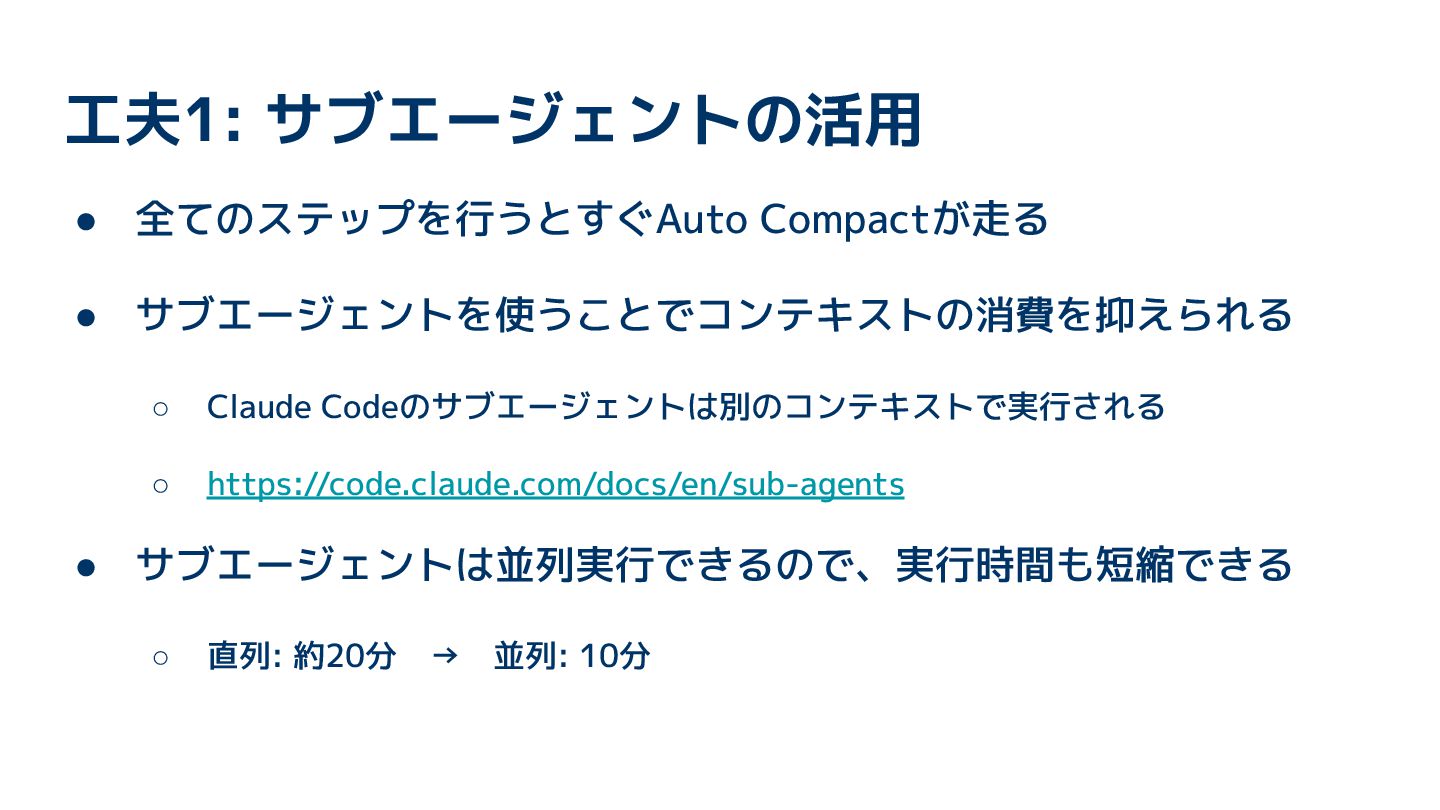 工夫1: サブエージェントの活用 • 全てのステップを行うとすぐAuto Compactが走る • サブエージェントを使うことでコンテキストの消費を抑えられる ◦ Claude Codeのサブエージェントは別のコンテキストで実行される