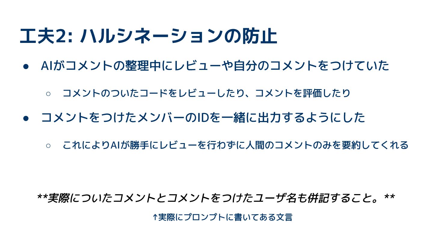 工夫2: ハルシネーションの防止 • AIがコメントの整理中にレビューや自分のコメントをつけていた ◦ コメントのついたコードをレビューしたり、コメントを評価したり • コメントをつけたメンバーのIDを一緒に出力するようにした ◦ これによりAIが勝手にレビューを行わずに人間のコメントのみを要約してくれる
