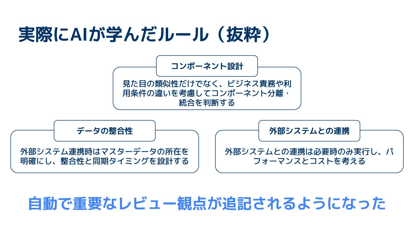 実際にAIが学んだルール(抜粋) 見た目の類似性だけでなく、ビジネス責務や利 用条件の違いを考慮してコンポーネント分離・ 統合を判断する コンポーネント設計 外部システムとの連携は必要時のみ実行し、パ フォーマンスとコストを考える 外部システムとの連携 外部システム連携時はマスターデータの所在を 明確にし、整合性と同期タイミングを設計する
