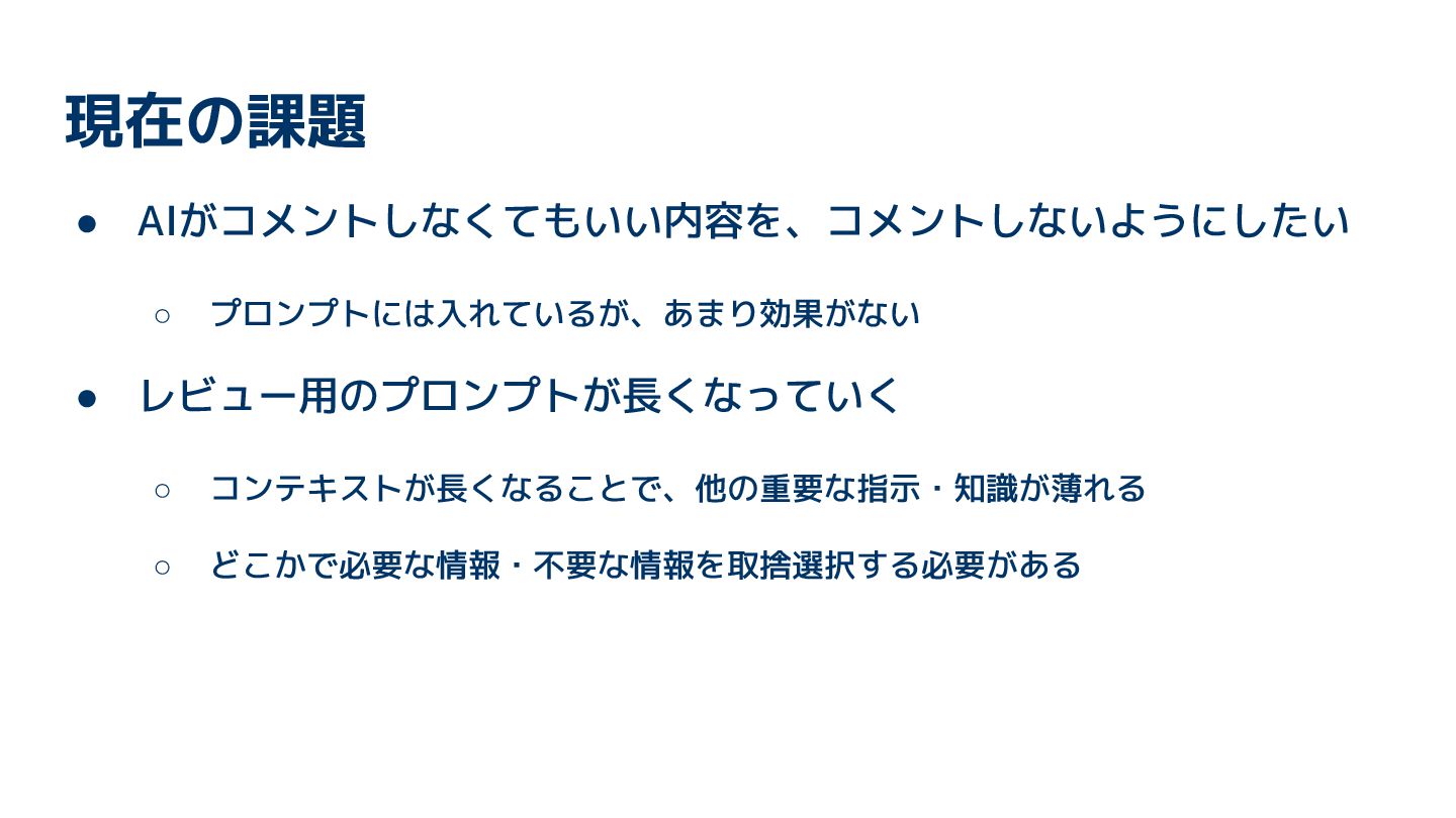 現在の課題 • AIがコメントしなくてもいい内容を、コメントしないようにしたい ◦ プロンプトには入れているが、あまり効果がない • レビュー用のプロンプトが長くなっていく ◦ コンテキストが長くなることで、他の重要な指示・知識が薄れる ◦