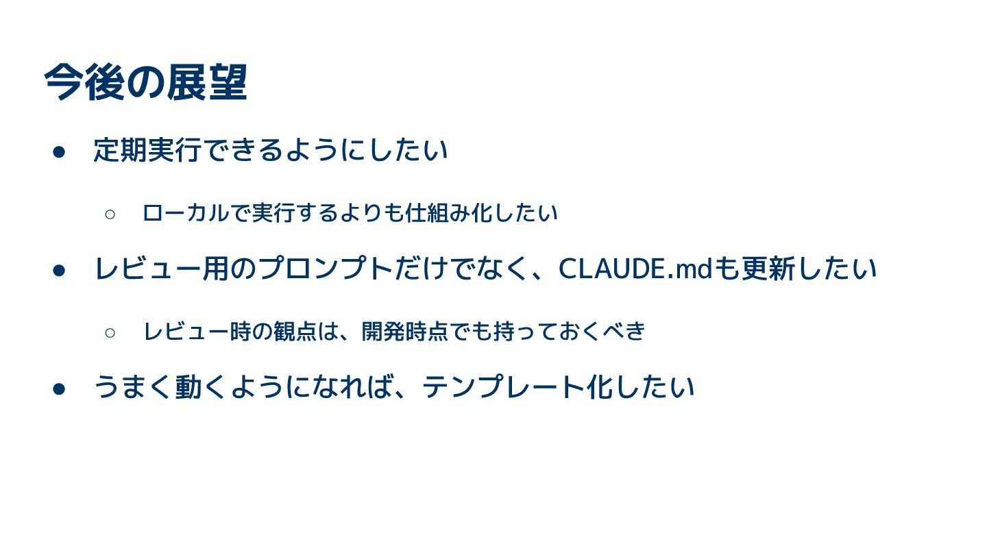 今後の展望 • 定期実行できるようにしたい ◦ ローカルで実行するよりも仕組み化したい • レビュー用のプロンプトだけでなく、CLAUDE.mdも更新したい ◦ レビュー時の観点は、開発時点でも持っておくべき •