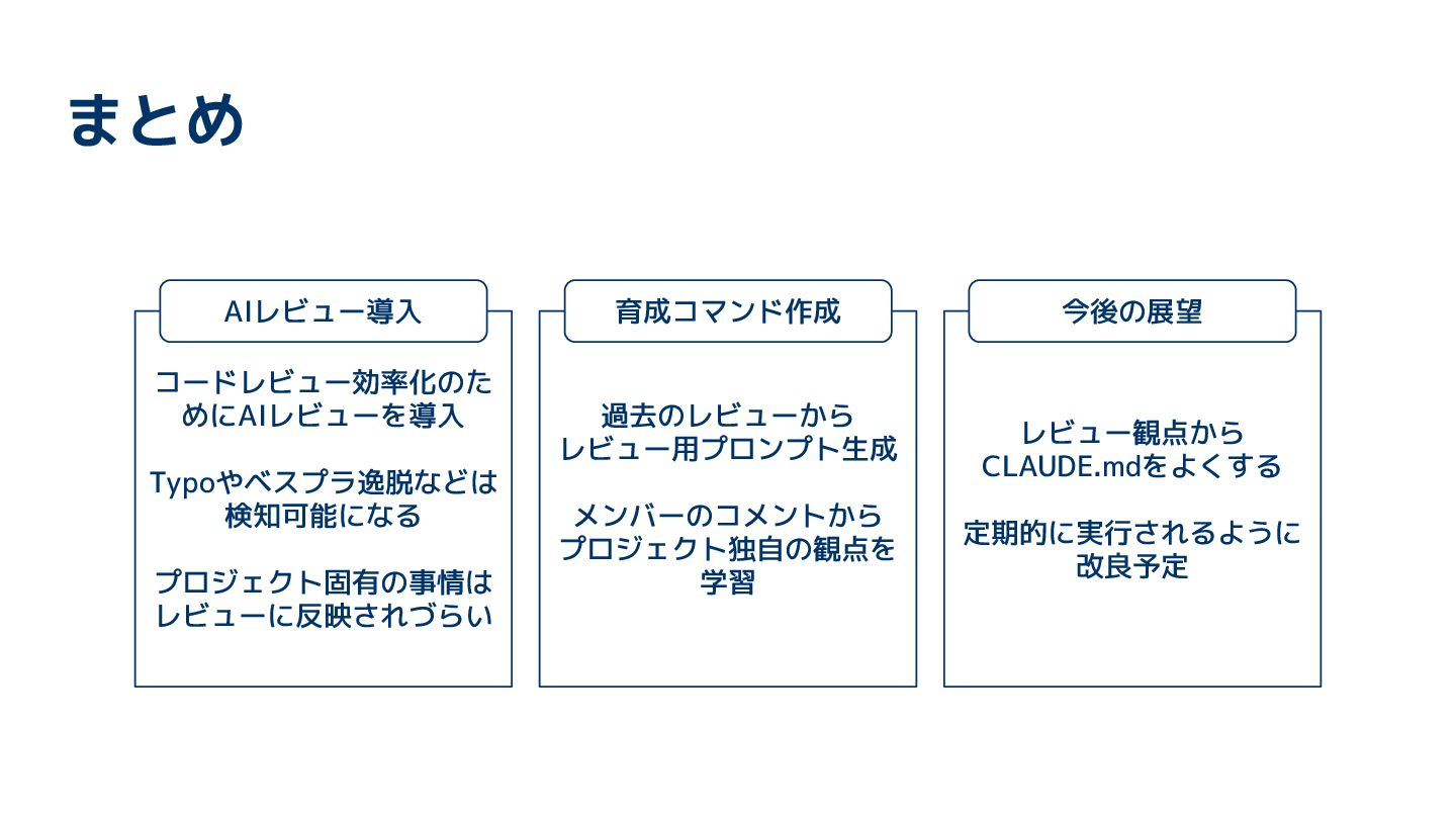 メンバーのコメントから プロジェクト独自の観点を 学習 育成コマンド作成 レビュー観点から CLAUDE.mdをよくする 定期的に実行されるように 改良予定 今後の展望