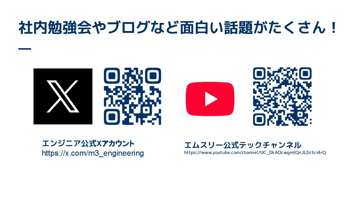 エムスリー公式テックチャンネル https://www.youtube.com/channel/UC_DkAOcwgmtQnJLDctci4rQ 社内勉強会やブログなど面白い話題がたくさん! エンジニア公式Xアカウント https://x.com/m3_engineering