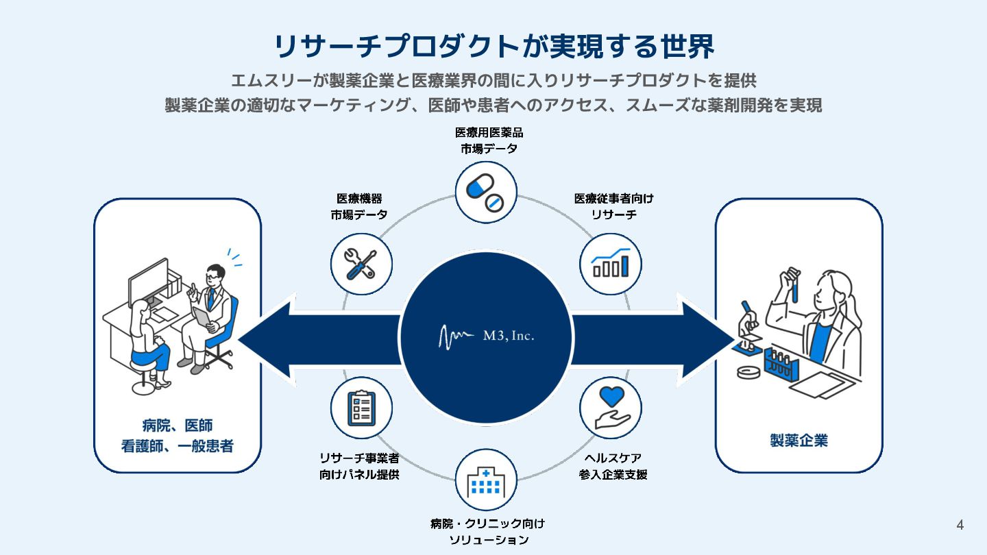 エムスリーが製薬企業と医療業界の間に入りリサーチプロダクトを提供 製薬企業の適切なマーケティング、医師や患者へのアクセス、スムーズな薬剤開発を実現 リサーチプロダクトが実現する世界 4