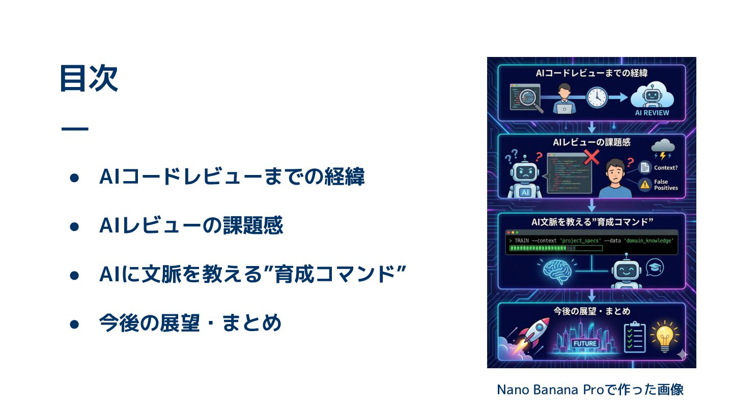 目次 • AIコードレビューまでの経緯 • AIレビューの課題感 • AIに文脈を教える”育成コマンド” • 今後の展望・まとめ Nano