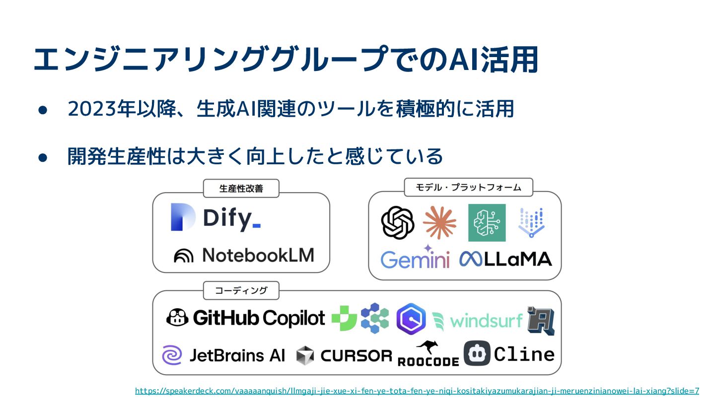 エンジニアリンググループでのAI活用 • 2023年以降、生成AI関連のツールを積極的に活用 • 開発生産性は大きく向上したと感じている https://speakerdeck.com/vaaaaanquish/llmgaji-jie-xue-xi-fen-ye-tota-fen-ye-niqi-kositakiyazumukarajian-ji-meruenzinianowei-lai-xiang?slide=7